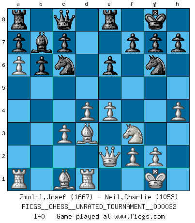 Last move : 1-0 2013 August 26 20:59:55 [Event "FICGS__CHESS__UNRATED_TOURNAMENT__000032"] [Site "FICGS"] [Date "2013.06.02"] [Round "1"] [White "Zmolil,Josef"] [Black "Neil,Charlie"] [Result "1-0"] [WhiteElo "1667"] [BlackElo "1053"] 1.d4 Nf6 2.c4 e6 3.Nc3 Bb4 4.e3 O-O 5.Bd3 d5 6.Nf3 b6 7.O-O Bb7 8.cxd5 Bxc3 9.bxc3 Nxd5 10.e4 Ne7 11.Qe2 Nd7 12.Rd1 Re8 13.a4 Nf8 14.a5 Qc8 15.h3 Nfg6 16.h4 Nc6 17.a6 1-0 Nimzo-Indian : 4.e3 O-O, 5.Bd3 d5 Kingside Castling by player Black (move 4) Kingside Castling by player White (move 7) Player White won this chess game. Follow this game move after move (download)Even the laziest King flees wildly in the face of a double check ! (Aaron Nimzowitsch) Strategie ist, wie man ein Mädchen auf den Rücksitz bekommt. Taktik ist, was man tut, wenn man dann dort ist. (Anonymous) La señal de un Gran Maestro es su habilidad de ganar una partida rápidamente y sin dolor. (Irving Chernev) Les Echecs ne sont pas pour les âmes timides. Ils requièrent un homme entier, qui ne s'arrête pas aveuglément à ce qui a été déjà établi, mais qui tente individuellement de sonder les profondeurs du jeu. (W. Steinitz) Thibault, I ask for draw. Game 13876. - Sorry Ilmars, you won. (FICGS chat)