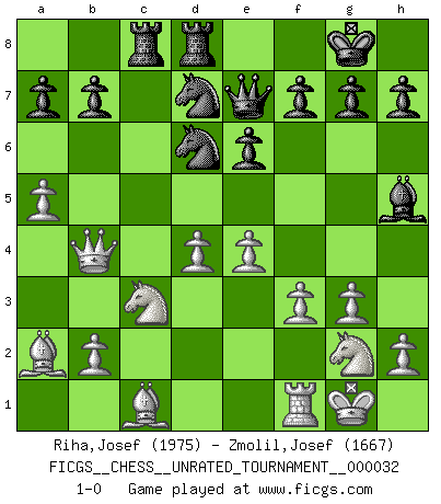 Last move : 1-0 2013 August 25 0:35:30 [Event "FICGS__CHESS__UNRATED_TOURNAMENT__000032"] [Site "FICGS"] [Date "2013.06.02"] [Round "1"] [White "Riha,Josef"] [Black "Zmolil,Josef"] [Result "1-0"] [WhiteElo "1975"] [BlackElo "1667"] 1.Nf3 d5 2.d4 Nf6 3.c4 c6 4.Nc3 dxc4 5.a4 Bf5 6.e3 e6 7.Bxc4 Bb4 8.O-O O-O 9.Qb3 Qe7 10.Nh4 Nbd7 11.a5 Bg4 12.f3 Bh5 13.e4 Ne8 14.g3 c5 15.Ra4 Nd6 16.Rxb4 cxb4 17.Qxb4 Rac8 18.Ba2 Rfd8 19.Ng2 1-0 This chess game has been lost on time (started : 2013.06.02 12:49:44) Reti Opening Kingside Castling by player White (move 8) Kingside Castling by player Black (move 8) Player White won this chess game. Follow this game move after move (download)Fischer was a master of clarity and a king of artful positioning. His opponents would see where he was going but were powerless to stop him. (Bruce Pandolfini) Wir irren allesamt, nur jeder irrt anders. (Georg Christoph Lichtenberg) Prefiero perder una partida realmente buena, que ganar una mala. (David Levy) Vous savez, camarade Pachman, je n'éprouve pas de plaisir à être ministre, je jouerais plutôt aux échecs comme vous, ou alors ferais une révolution au Venezuela. (Che Guevara à Ludek Pachman, 'Checkmate in Prague', 1975) Art is the triumph over chaos. (John Cheever)