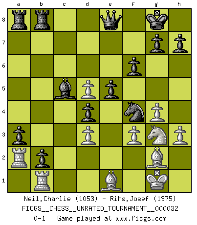 Last move : 0-1 2013 July 1 1:4:53 [Event "FICGS__CHESS__UNRATED_TOURNAMENT__000032"] [Site "FICGS"] [Date "2013.06.02"] [Round "1"] [White "Neil,Charlie"] [Black "Riha,Josef"] [Result "0-1"] [WhiteElo "1053"] [BlackElo "1975"] 1.c4 Nf6 2.Nc3 e5 3.g3 d5 4.Bg2 d4 5.Ne4 Nxe4 6.Bxe4 Na6 7.d3 Nc5 8.Bg2 a5 9.Nf3 Bd6 10.O-O O-O 11.Bd2 c6 12.b3 Bg4 13.h3 Bf5 14.Nh4 Be6 15.Nf3 Qf6 16.Re1 Bf5 17.Bg5 Qg6 18.e4 Bd7 19.Qd2 f6 20.Bh4 Ne6 21.a3 Nc5 22.b4 axb4 23.Qc2 bxa3 24.Reb1 Rfb8 25.g4 b5 26.Bg3 Ne6 27.cxb5 cxb5 28.Nh4 Qe8 29.Nf5 Bc5 30.f3 b4 31.Be1 Ba4 32.Qc4 b3 33.Ng3 b2 34.Ra2 Bb3 35.Qd5 Bxd5 36.exd5 Nf4 0-1 English Opening Kingside Castling by player White (move 10) Kingside Castling by player Black (move 10) Player Black won this chess game. Follow this game move after move (download)It's always better to sacrifice your opponent's men. (Savielly Tartakover) Auf Remis zu spielen ist gewissermaßen ein Verbrechen gegen das Schachspiel. (Mikhail Nekhemyevich Tal) En el Ajedrez, tal como en la vida, las bendiciones de hoy pueden ser el veneno del mañana. (Assaic) Des combinaisons [dans le jeu d'échecs] pareilles à des mélodies. Je crois entendre pour ainsi dire la musique des coups... (Vladimir Nabokov) Waiting for chance ? Play in casinos. (FICGS proverb)