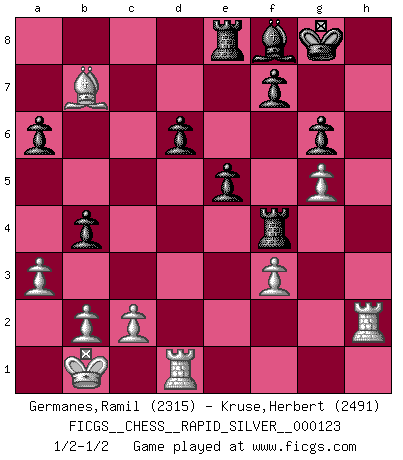 Last move : 1/2-1/2 2013 June 9 15:11:20 [Event "FICGS__CHESS__RAPID_SILVER__000123"] [Site "FICGS"] [Date "2013.06.03"] [Round "2"] [White "Germanes,Ramil"] [Black "Kruse,Herbert"] [Result "1/2-1/2"] [WhiteElo "2315"] [BlackElo "2491"] 1.e4 c5 2.Nf3 d6 3.d4 cxd4 4.Nxd4 Nf6 5.Nc3 a6 6.Be3 e5 7.Nb3 Be6 8.f3 Be7 9.Qd2 O-O 10.O-O-O Nbd7 11.g4 b5 12.g5 Nh5 13.Kb1 Nb6 14.Na5 Rc8 15.a3 g6 16.h4 Qc7 17.Rh2 Rfe8 18.Nd5 Nxd5 19.exd5 Bxd5 20.Qxd5 Qxa5 21.Bh3 Rc4 22.Bg4 Nf4 23.Bxf4 Rxf4 24.h5 Bf8 25.hxg6 hxg6 26.Qb7 Qd8 27.Bd7 Qe7 28.Bc6 Qxb7 29.Bxb7 b4 1/2-1/2 Sicilian : Najdorf, Byrne (English) attack Kingside Castling by player Black (move 9) Queenside Castling by player White (move 10) This chess game ended in a draw. Follow this game move after move (download)I'd rather have a Pawn than a finger. (Reuben Fine) Man kann eine Schachpartie nur gewinnen, wenn das Gleichgewicht gestört ist. In einer Stellung mit ungestörtem Gleichgewicht ist auch das größte Genie hilflos - in der Stellung steckt dann eben kein genialer Einfall. (Wilhelm Steinitz) La batalla por la última verdad nunca sera ganada. Y es por eso que el Ajedrez es tan fascinante. (Hans Kmoch) Avec des compensations pour le matériel en plus... (Anonyme) Life doesn't imitate art, it imitates bad television. (Woody Allen)