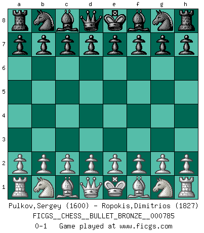 Last move : 0-1 2013 June 3 10:18:49 [Event "FICGS__CHESS__BULLET_BRONZE__000785"] [Site "FICGS"] [Date "2013.06.03"] [Round "1"] [White "Pulkov,Sergey"] [Black "Ropokis,Dimitrios"] [Result "0-1"] [WhiteElo "1600"] [BlackElo "1827"] 0-1 This chess game has been lost on time (started : 2013.06.03 8:14:6) Player Black won this chess game. Follow this game move after move (download)I look one move ahead... the best ! (Siegbert Tarrasch) Über Frauen: Chess is better. (Robert James Fischer) Ciertamente, de todas la drogas del mundo, el Ajedrez debe ser el mas placentero permamentemente. (Assiac) Aidez vos pièces, elles vous aideront. (Paul Morphy) Whenever people agree with me, I always feel I must be wrong. (Oscar Wilde)