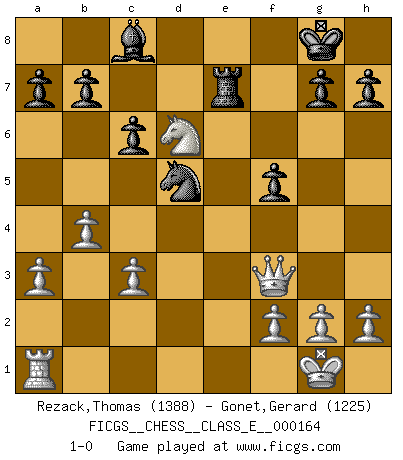 Last move : 1-0 2013 July 6 17:27:50 [Event "FICGS__CHESS__CLASS_E__000164"] [Site "FICGS"] [Date "2013.06.05"] [Round "1"] [White "Rezack,Thomas"] [Black "Gonet,Gerard"] [Result "1-0"] [WhiteElo "1388"] [BlackElo "1225"] 1.e4 e5 2.Nf3 f5 3.Bc4 Nf6 4.Nxe5 Qe7 5.Nf3 Qxe4+ 6.Be2 Bc5 7.Nc3 Qe7 8.O-O d5 9.Re1 O-O 10.d4 Bb6 11.Bc4 dxc4 12.Rxe7 Nc6 13.Re1 Bd7 14.Be3 Rae8 15.a3 Ne7 16.Bg5 c6 17.Ne5 Bc8 18.Qf3 Nfd5 19.Nxc4 Bxd4 20.Nxd5 Nxd5 21.Rxe8 Rxe8 22.c3 Bc5 23.b4 Be7 24.Bxe7 Rxe7 25.Nd6 1-0 Latvian gambit, 3.Bc4 Kingside Castling by player White (move 8) Kingside Castling by player Black (move 9) Player White won this chess game. Follow this game move after move (download)I give 98 percent of my mental energy to Chess. Others give only 2 percent. (Bobby Fischer) Wenn sie aufgeben, dann danke ich Ihnen für das Spiel (Eventualzug beim Fernschach). (Anonymous) El Ajedrez no es como la vida... ¡tiene reglas!. (Mark Pasternak) On peut tirer plus d'utilité d'une partie perdue que de 100 parties gagnées. (Capablanca) If you have any trouble condescending, find a Unix user to show you how it's done. (Scott Adams)