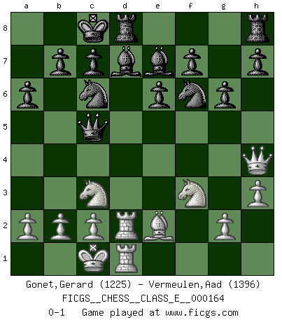 Last move : 0-1 2013 June 12 22:28:46 [Event "FICGS__CHESS__CLASS_E__000164"] [Site "FICGS"] [Date "2013.06.05"] [Round "1"] [White "Gonet,Gerard"] [Black "Vermeulen,Aad"] [Result "0-1"] [WhiteElo "1225"] [BlackElo "1396"] 1.d4 Nf6 2.f3 d5 3.e4 dxe4 4.Nc3 exf3 5.Qxf3 Qxd4 6.Be3 Qg4 7.Qf2 a6 8.Be2 Qb4 9.O-O-O e6 10.Rd4 Qe7 11.Nf3 Nc6 12.Rd2 Bd7 13.Rhd1 O-O-O 14.h3 g6 15.Bc5 Qxc5 16.Qh4 Be7 0-1 Blackmar-Diemer gambit Queenside Castling by player White (move 9) Queenside Castling by player Black (move 13) Player Black won this chess game. Follow this game move after move (download)During a Chess competition a Chessmaster should be a combination of a beast of prey and a monk. (Alexander Alekhine) Smyslow ist ein Beweis dafür, dass ich noch zehn Jahre spielen kann! [der 75 jährige über den 85 jährigen] (Viktor Kortschnoi) Fischer sacrificó virtualmente todo lo que la mayoría de nosotros los 'debiles' (término que él usa) valoramos, respetamos y apreciamos por el amor de un astuto, a menudo hermoso tablero de juego, por el privilegio ambivalente de ser su mas grande maestro. (Paul Kollar) Donnez-moi un Cavalier en 6e et je gagnerais toutes mes parties. (Steinitz) Fortune favours the audacious. (Desiderius Erasmus)