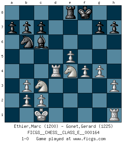 Last move : 1-0 2013 June 29 11:41:47 [Event "FICGS__CHESS__CLASS_E__000164"] [Site "FICGS"] [Date "2013.06.05"] [Round "1"] [White "Ethier,Marc"] [Black "Gonet,Gerard"] [Result "1-0"] [WhiteElo "1200"] [BlackElo "1225"] 1.e4 e5 2.Bc4 Nf6 3.d4 d5 4.exd5 Nxd5 5.dxe5 Nb6 6.Qxd8+ Kxd8 7.Bxf7 Bf5 8.Bg5+ Be7 9.Bxe7+ Kxe7 10.Bb3 Re8 11.f4 Nc6 12.Ne2 Kf8 13.Nd2 Na5 14.O-O-O Rad8 15.h3 Nxb3+ 16.axb3 Rd5 17.g4 Bd7 18.Nc3 Rd4 19.Nde4 Bc6 20.Rxd4 1-0 Bishop's Opening : Ponziani gambit Queenside Castling by player White (move 14) Player White won this chess game. Follow this game move after move (download)In Chess, just as in life, today's bliss may be tomorrow's poison. (Assaic) Es gibt keine einzige Frau, der ich nicht einen Springer vorgeben könnte und trotzdem gewänne. (Robert James Fischer) Me dio la sensación de como si yo estuviera jugando en contra del mismo Ajedrez. - al estar jugando en contra de Robert Fischer (Walter Shipman) Lorsque vous vous retrouvez devant une position atroce, ne tendez pas un ultime piège dérisoire avec l'intention d'abandonner si l'adversaire le déjoue ! Faites-vous plutôt un devoir de résister comme si votre vie en dépendait. Jouez le coup qui vous déplairait au centuple si vous étiez dans la peau de votre tortionnaire ! Everything in life is luck. (Donald Trump)