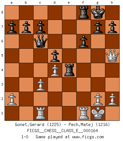 Last move : 1-0 2013 August 30 0:58:50 [Event "FICGS__CHESS__CLASS_E__000164"] [Site "FICGS"] [Date "2013.06.05"] [Round "1"] [White "Gonet,Gerard"] [Black "Pech,Matej"] [Result "1-0"] [WhiteElo "1225"] [BlackElo "1216"] 1.d4 f5 2.e4 fxe4 3.Nc3 Nf6 4.f3 d5 5.Bg5 Nc6 6.Bb5 Qd6 7.Bxc6+ Qxc6 8.Bxf6 exf6 9.Qe2 Bb4 10.Qe3 Bxc3+ 11.bxc3 O-O 12.Ne2 Bf5 13.O-O exf3 14.Qxf3 Bxc2 15.Ng3 Rae8 16.Rac1 Be4 17.Nxe4 Rxe4 18.Qh5 1-0 This chess game has been lost on time (started : 2013.06.05 18:22:44) Dutch : Staunton gambit Kingside Castling by player Black (move 11) Kingside Castling by player White (move 13) Player White won this chess game. Follow this game move after move (download)The game of Chess is not merely an idle amusement; several very valuable qualities of the mind are to be acquired and strengthened by it, so as to become habits ready on all occasions; for life is a kind of Chess. (Benjamin Franklin) Dass jemand wie Surab Asmaiparaschwili, der selbst Elopunkte gekauft hat , Vize-Präsident der Fide werden konnte, sagt schon einges über den Zustand dieser Organisation aus. (Joel Lautier) Entre mas años cumplo, mas valoro los Peones. (Keres) Psychologiquement, tu dois avoir confiance en toi même, mais cette confiance doit être basée sur des faits. (Robert Fischer) Faith : not wanting to know what is true. (Friedrich Nietzsche)