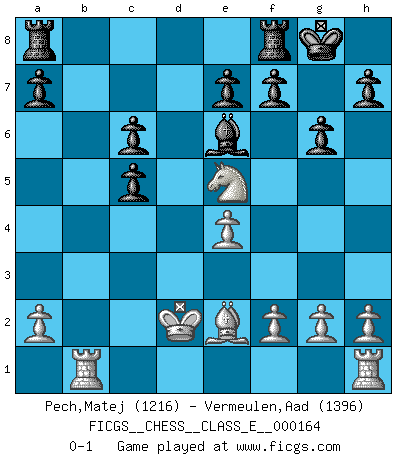 Last move : 0-1 2013 August 31 0:58:41 [Event "FICGS__CHESS__CLASS_E__000164"] [Site "FICGS"] [Date "2013.06.05"] [Round "1"] [White "Pech,Matej"] [Black "Vermeulen,Aad"] [Result "0-1"] [WhiteElo "1216"] [BlackElo "1396"] 1.d4 Nf6 2.c4 g6 3.Nc3 d5 4.cxd5 Nxd5 5.e4 Nxc3 6.bxc3 Bg7 7.Nf3 c5 8.Rb1 O-O 9.Be2 Nc6 10.d5 Bxc3+ 11.Bd2 Qa5 12.dxc6 Bxd2+ 13.Qxd2 Qxd2+ 14.Kxd2 bxc6 15.Ne5 Be6 0-1 This chess game has been lost on time (started : 2013.06.05 18:22:44) King's Indian defense, 3.Nc3 Kingside Castling by player Black (move 8) Player Black won this chess game. Follow this game move after move (download)By this measure (on the gap between Fischer & his contemporaries), I consider him the greatest world champion. (Garry Kasparov) Wer mein Gambit spielt, muß bereit sein, alle Brücken hinter sich abzubrechen. Es verändert den ganzen Menschen. Es wirkt wie ein Zauberstab und fördert verkümmerte, gute Charakter- eigenschaften wieder zu Tage. (Emil Joseph Diemer) La batalla por la última verdad nunca sera ganada. Y es por eso que el Ajedrez es tan fascinante. (Hans Kmoch) En blitz, le Cavalier l'emporte sur le Fou. (Vlastimil Hort) A good teacher is like a candle - it consumes itself to light the way for others. (Author unknown)