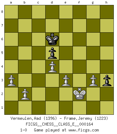 Last move : 1-0 2013 July 11 19:1:20 [Event "FICGS__CHESS__CLASS_E__000164"] [Site "FICGS"] [Date "2013.06.05"] [Round "1"] [White "Vermeulen,Aad"] [Black "Frame,Jeremy"] [Result "1-0"] [WhiteElo "1396"] [BlackElo "1223"] 1.d4 d5 2.c4 c6 3.Nf3 Nf6 4.Nc3 e6 5.Bg5 Be7 6.e3 Nbd7 7.Qc2 h6 8.Bh4 O-O 9.Be2 b6 10.O-O Nh7 11.Bxe7 Qxe7 12.cxd5 cxd5 13.Rac1 Bb7 14.Qd2 Rac8 15.Rc2 f5 16.Rfc1 Nhf6 17.a3 Ne4 18.Qe1 Nxc3 19.Rxc3 Rxc3 20.Rxc3 Rc8 21.Rxc8+ Bxc8 22.Qc3 Qd8 23.Bb5 Nf6 24.Nd2 a6 25.Be2 Bb7 26.f3 Ne8 27.Nb3 Qc7 28.Qxc7 Nxc7 29.Kf2 a5 30.Nc1 Bc6 31.Nd3 Bb5 32.Ne5 Bxe2 33.Kxe2 b5 34.Nc6 a4 35.Na7 Kf7 36.Kd2 Ke8 37.Kc3 g5 38.Kb4 Kd7 39.Nxb5 Nxb5 40.Kxb5 Kd6 41.Kxa4 e5 42.Kb5 e4 43.Kb4 exf3 44.gxf3 g4 45.Kc3 h5 46.fxg4 fxg4 47.Kd2 h4 48.Ke2 g3 49.hxg3 h3 50.Kf2 1-0 QGD Slav : 4.Nc3 Kingside Castling by player Black (move 8) Kingside Castling by player White (move 10) 10 pieces endgame at move 46 : White KPPPPP , Black KPPP WHITE : King + 5 Pawns BLACK : King + 3 Pawns 9 pieces endgame at move 49 : White KPPPPP , Black KPP WHITE : King + 5 Pawns BLACK : King + 2 Pawns Player White won this chess game. Follow this game move after move (download)The defensive power of a pinned piece is only imaginary. (Aaron Nimzovich) Ich bewundere Kasparows phantasievolle Angriffssiege aus den Achtzigern und Neunzigern, aber wenn man sie mit dem Computer überprüft, nimmt der Computer in jeder zweiten Partie die Opfer an, verteidigt sich und gewinnt. (Vladimir Kramnik) De todos mis libros Rusos, la defensa contiene y difunde el 'calor' mas grande que pudiese verse extraño al observar lo supremamente abstracto que el Ajedrez supuestamente es. (Vladimir Nabokov) Les Echecs ne sont pas pour les âmes timides. Ils requièrent un homme entier, qui ne s'arrête pas aveuglément à ce qui a été déjà établi, mais qui tente individuellement de sonder les profondeurs du jeu. (W. Steinitz) Every now and then a man's mind is stretched by a new idea and never shrinks back to its former dimensions. (Oliver Wendell Holmes, Sr.)