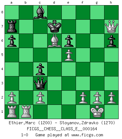 Last move : 1-0 2013 August 3 20:6:25 [Event "FICGS__CHESS__CLASS_E__000164"] [Site "FICGS"] [Date "2013.06.05"] [Round "1"] [White "Ethier,Marc"] [Black "Stoyanov,Zdravko"] [Result "1-0"] [WhiteElo "1200"] [BlackElo "1270"] 1.e4 c5 2.Nf3 a6 3.d4 cxd4 4.Nxd4 e6 5.Nc3 h6 6.Be2 Bb4 7.O-O Nf6 8.e5 Bxc3 9.bxc3 Nd5 10.Qd3 Qc7 11.Qg3 g6 12.c4 Nb6 13.Ba3 Nxc4 14.Qc3 b5 15.Bxc4 bxc4 16.Qf3 Nc6 17.Nxc6 Qxc6 18.Qf6 d6 19.Bxd6 Ra7 20.Qxh8+ Kd7 21.Qf8 Qb6 22.Qxf7+ Kc6 23.Qxg6 Qb2 24.Rfb1 Qc3 25.Qe4+ Kd7 26.Qh7+ 1-0 Sicilian : O'Kelly variation Kingside Castling by player White (move 7) Player White won this chess game. Follow this game move after move (download)Excellence at Chess is one mark of a scheming mind. (Sir Arthur Conan Doyle) Ich würde mich als ganz normalen Jungen bezeichnen [Im Alter von 12]. (Sergej Karjakin) El Peón aislado arroja penumbra sobre todo el tablero. (Aaron Nimzovich) Avec des compensations pour le matériel en plus... (Anonyme) Man is reluctant to give credit for intelligence to anyone, except his enemies. (Albert Einstein)