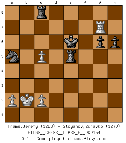 Last move : 0-1 2013 June 23 22:21:12 [Event "FICGS__CHESS__CLASS_E__000164"] [Site "FICGS"] [Date "2013.06.05"] [Round "1"] [White "Frame,Jeremy"] [Black "Stoyanov,Zdravko"] [Result "0-1"] [WhiteElo "1223"] [BlackElo "1270"] 1.e4 c5 2.Nf3 a6 3.d4 cxd4 4.Nxd4 e5 5.Nf3 d6 6.Bc4 h6 7.Bxf7+ Kxf7 8.Nxe5+ Kf6 9.f4 Be7 10.Nf3 Bg4 11.Qd4+ Kf7 12.Nc3 Bxf3 13.gxf3 Bf6 14.Qd5+ Kf8 15.Be3 Nc6 16.O-O-O Nge7 17.Qxd6 Qxd6 18.Rxd6 Bxc3 19.bxc3 Kf7 20.Rhd1 Rac8 21.Rd7 b5 22.Bc5 g6 23.R1d6 Rhe8 24.e5 Nxe5 25.fxe5 Rxc5 26.Rxa6 Rxe5 27.Rb7 Re1+ 28.Kb2 Rf1 29.Rxb5 Rxf3 30.c4 Rh3 31.c5 Rc8 32.Ra7 Rxh2 33.R5b7 Re2 34.Ra5 Re5 35.R7b5 Nc6 36.Rb7+ Ke6 37.Rg7 Nxa5 0-1 Sicilian : O'Kelly variation Queenside Castling by player White (move 16) Player Black won this chess game. Follow this game move after move (download)We must make sure that Chess will not be like a dead language, very interesting, but for a very small group. (Sytze Faber) Sie bekommen vielleicht den Eindruck, dass die Spitzenspieler überhaupt gar nicht so stark sind. Aber das stimmt nicht. Es ist eine Illusion. Mit einem Computer an der Seite ist es sehr leicht, Urteile zu fällen, aber wenn man alleine am Brett sitzt, sieht die Sache ganz anders aus. (Vladimir Kramnik) Puntos débiles o agujeros en la posición de tu oponente deben de ser ocupados por piezas, no Peones. (Siegbert Tarrasch) On peut tirer plus d'utilité d'une partie perdue que de 100 parties gagnées. (Capablanca) Establishing goals is all right if you don't let them deprive you of interesting detours. (Doug Larson)