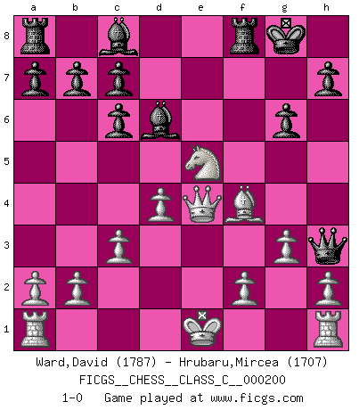 Last move : 1-0 2013 September 21 14:38:28 [Event "FICGS__CHESS__CLASS_C__000200"] [Site "FICGS"] [Date "2013.06.05"] [Round "1"] [White "Ward,David"] [Black "Hrubaru,Mircea"] [Result "1-0"] [WhiteElo "1787"] [BlackElo "1707"] 1.e4 e5 2.Nf3 Nc6 3.Bb5 Bc5 4.c3 f5 5.d4 fxe4 6.Bxc6 dxc6 7.Nxe5 Bd6 8.Qh5+ g6 9.Qe2 Qh4 10.Nd2 Nf6 11.g3 Qh3 12.Nxe4 Nxe4 13.Qxe4 O-O 14.Bf4 1-0 This chess game has been lost on time (started : 2013.06.05 23:44:33) Ruy Lopez : Cordel gambit Kingside Castling by player Black (move 13) Player White won this chess game. Follow this game move after move (download)We must make sure that Chess will not be like a dead language, very interesting, but for a very small group. (Sytze Faber) Ein guter Spieler hat immer Glück. (José Raúl Capablanca) El juego de Damas es para vagabundos. (Paul Morphy) Des points faibles ou des trous dans la position de l'adversaire doivent être occupés par des pièces et non pas par des pions. (Siegbert Tarrasch) There are lots of people who mistake their imagination for their memory. (Josh Bilings)