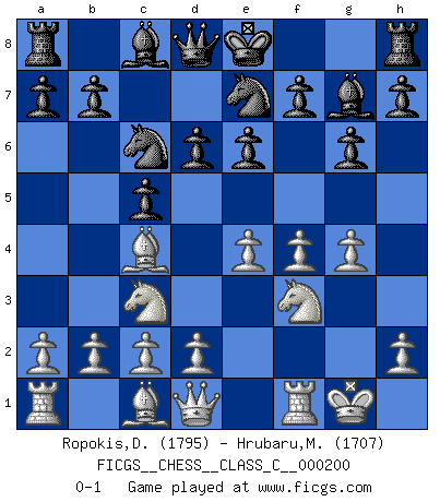 Last move : 0-1 2013 August 17 18:19:50 [Event "FICGS__CHESS__CLASS_C__000200"] [Site "FICGS"] [Date "2013.06.05"] [Round "1"] [White "Ropokis,Dimitrios"] [Black "Hrubaru,Mircea"] [Result "0-1"] [WhiteElo "1795"] [BlackElo "1707"] 1.e4 c5 2.Nc3 d6 3.f4 g6 4.Nf3 Bg7 5.Bc4 Nc6 6.O-O e6 7.g4 Nge7 0-1 This chess game has been lost on time (started : 2013.06.05 23:44:33) Sicilian : Closed Kingside Castling by player White (move 6) Player Black won this chess game. Follow this game move after move (download)Chess is a part of culture and if a culture is declining then Chess too will decline. (Mikhail Botvinnik) Wir irren allesamt, nur jeder irrt anders. (Georg Christoph Lichtenberg) Después de la respuesta de las negras a 1.e4 con 1..e5, se quedan siempre tratando de entrar dentro del juego. (Howard Staunton) Toutes les manuvres exécutées sur une colonne ouverte ont pour but ultime l'intrusion définitive sur la septième ou la huitième rangée, en plein cur de la position ennemie. (Aaron Nimzovitch) You can only get smarter by playing a smarter opponent. (Revolver, movie)