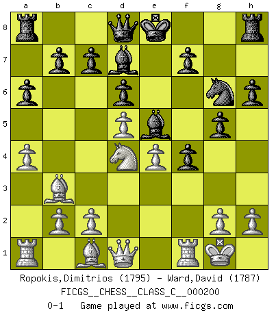 Last move : 0-1 2013 October 8 15:28:31 [Event "FICGS__CHESS__CLASS_C__000200"] [Site "FICGS"] [Date "2013.06.05"] [Round "1"] [White "Ropokis,Dimitrios"] [Black "Ward,David"] [Result "0-1"] [WhiteElo "1795"] [BlackElo "1787"] 1.e4 e5 2.f4 exf4 3.Nf3 d6 4.Bc4 h6 5.d4 g5 6.O-O Nc6 7.Nc3 Nge7 8.d5 Ne5 9.Bb3 Bg7 10.Nxe5 Bxe5 11.Ne2 Ng6 12.Nd4 Bd7 13.a4 a6 0-1 This chess game has been lost on time (started : 2013.06.05 23:44:33) KGA : Fischer defense Kingside Castling by player White (move 6) Player Black won this chess game. Follow this game move after move (download)The laws of Chess do not permit a free choice: you have to move whether you like it or not. (Emanuel Lasker) Die Auseinandersetzung mit Karpow war politisch geprägt. Er stand für das kommunistische System, wurde von dessen Repräsentanten gehätschelt. Ich war der Oppositionelle. Jeder Schachweltmeister spiegelt auch die gesellschaftlichen Verhältnisse wider. Kramnik steht für die Börsen-Generation des Neuen Markts, ideologiefrei, zahlenfixiert. (Garry Kasparov) La vida es como un juego de Ajedrez, cambiando con cada movimiento. (Proverbio Chino) Soyez une menace à chaque fois que vous vous asseyez pour jouer. (Ken Smith) It is not enough to be a good player... you must also play well. (Siegbert Tarrasch)