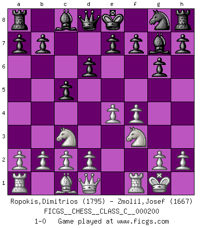 Last move : 1-0 2013 September 3 13:15:43 [Event "FICGS__CHESS__CLASS_C__000200"] [Site "FICGS"] [Date "2013.06.05"] [Round "1"] [White "Ropokis,Dimitrios"] [Black "Zmolil,Josef"] [Result "1-0"] [WhiteElo "1795"] [BlackElo "1667"] 1.e4 c5 2.Nc3 Nc6 3.f4 g6 4.Nf3 Bg7 5.Bb5 Nd4 6.O-O Nxb5 7.Nxb5 d6 8.Nc3 1-0 This chess game has been lost on time (started : 2013.06.05 23:44:33) Sicilian : Grand Prix attack Kingside Castling by player White (move 6) Player White won this chess game. Follow this game move after move (download)Mistrust is the most necessary characteristic of the Chess player. (Siegbert Tarrasch) Irgendwie scheint mir sonntags früh um 9 Uhr der Killerinstinkt verloren gegangen zu sein. (Alexej Shirov) Cada Peón es una Reina en potencia. (James Mason) Vous n'êtes pas toujours obligé de jouer le meilleur coup. Un coup doit être actif, entreprenant, correct et beau ! (David Bronstein) Life is the sum of all your choices. (Albert Camus)