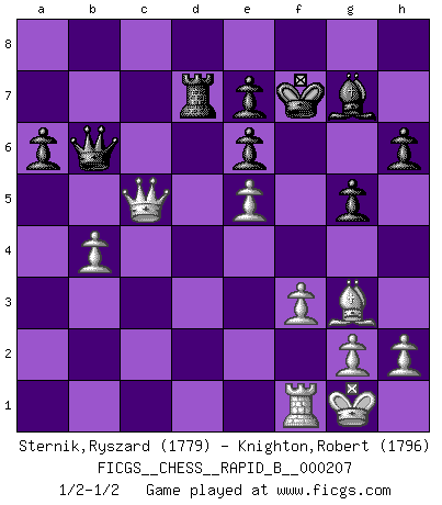 Last move : 1/2-1/2 2013 July 6 19:5:49 [Event "FICGS__CHESS__RAPID_B__000207"] [Site "FICGS"] [Date "2013.06.07"] [Round "1"] [White "Sternik,Ryszard"] [Black "Knighton,Robert"] [Result "1/2-1/2"] [WhiteElo "1779"] [BlackElo "1796"] 1.e4 c5 2.Nf3 d6 3.d4 cxd4 4.Nxd4 Nf6 5.Nc3 g6 6.Be3 a6 7.Qd2 Ng4 8.Bg5 h6 9.Bh4 Bg7 10.Nd5 g5 11.Bg3 Nc6 12.c3 Nf6 13.Nxf6+ Bxf6 14.Bc4 Nxd4 15.cxd4 Qb6 16.Rd1 Bg4 17.f3 Be6 18.Bxe6 fxe6 19.e5 dxe5 20.dxe5 Bg7 21.Qd4 Qa5+ 22.b4 Qb5 23.a3 Kf7 24.Kf2 Rhd8 25.Qe4 Qa4 26.Rxd8 Rxd8 27.Rf1 Qxa3 28.Kg1 Qd3 29.Qxb7 Rd7 30.Qc6 Qb5 31.Qc8 Qb6+ 32.Qc5 1/2-1/2 Sicilian : Dragon, 6.Be3 This chess game ended in a draw. Follow this game move after move (download)Pawns: they are the soul of this game, they alone form the attack and defense. (Philidor) Man gibt nur Pakete auf. (Paul Keres) Aquellos que dicen entender al Ajedrez, no entienden nada. (Robert Hubner) Donnez-moi un Cavalier en 6e et je gagnerais toutes mes parties. (Steinitz) There is a very easy way to return from a casino with a small fortune : go there with a large one. (Jack Yelton)