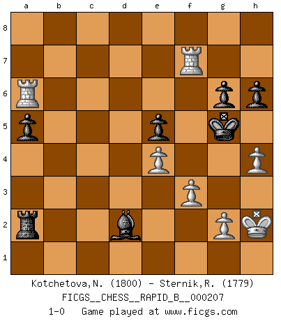 Last move : 1-0 2013 July 9 23:8:36 [Event "FICGS__CHESS__RAPID_B__000207"] [Site "FICGS"] [Date "2013.06.07"] [Round "1"] [White "Kotchetova,Nadezhda"] [Black "Sternik,Ryszard"] [Result "1-0"] [WhiteElo "1800"] [BlackElo "1779"] 1.d4 Nf6 2.c4 g6 3.Nc3 Bg7 4.e4 d6 5.Nf3 O-O 6.Be2 e5 7.d5 a5 8.Bg5 h6 9.Bh4 Na6 10.Nd2 Bd7 11.O-O c6 12.f3 Rb8 13.Rc1 Re8 14.a3 Qc7 15.Kh1 Nh5 16.c5 dxc5 17.Bxa6 bxa6 18.Nc4 Nf4 19.d6 Qb7 20.Be7 Be6 21.Na4 Bxc4 22.Rxc4 Rxe7 23.dxe7 Qxe7 24.Qc2 Ne6 25.Nxc5 Nxc5 26.Rxc5 Rxb2 27.Qc4 Rb5 28.Rxc6 Qxa3 29.h3 Qb4 30.Qa2 Qb2 31.Qxb2 Rxb2 32.Rxa6 Ra2 33.Rc1 Bf8 34.Rc7 Bb4 35.Ra8+ Kg7 36.R8a7 Kf6 37.Rxf7+ Kg5 38.Ra6 Be1 39.Kh2 Bd2 40.h4+ 1-0 King's Indian : Petrosian system, Stein variation Kingside Castling by player Black (move 5) Kingside Castling by player White (move 11) Player White won this chess game. Follow this game move after move (download)The most important feature of the Chess position is the activity of the pieces. This is absolutely fundamental in all phases of the game: Opening, Middlegame and especially Endgame. The primary constraint on a piece's activity is the Pawn structure. (Michael Stean) Kleine Schachspieler machen Mist, und große Schachspieler machen Mist, aber große machen weniger Mist. (Fritz Sämisch) No nos podemos resistir a la fascinación de un sacrificio ya que la pasión por los sacrificios es parte de la naturaleza de un jugador de Ajedrez. (Rudolf Spielman) Même si l'adversaire joue le coup analysé précédemment, recommencez l'analyse en voyant la nouvelle position. Première règle de Blumenfeld The beginning of wisdom is silence. The second step is listening. (Unknown)
