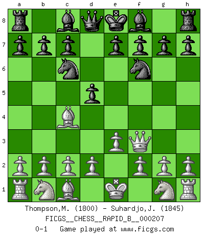 Last move : 0-1 2013 July 13 15:11:14 [Event "FICGS__CHESS__RAPID_B__000207"] [Site "FICGS"] [Date "2013.06.07"] [Round "1"] [White "Thompson,Matthew"] [Black "Suhardjo,Johanes"] [Result "0-1"] [WhiteElo "1800"] [BlackElo "1845"] 1.e3 Nf6 2.Qf3 Nc6 3.Bc4 d5 0-1 This chess game has been lost on time (started : 2013.06.07 11:21:36) Van't Kruijs Opening Player Black won this chess game. Follow this game move after move (download)Chess is a matter of delicate judgment, knowing when to punch and how to duck. (Bobby Fischer) Wenn Spassky eine Figur opfert kannst du genauso gut aufgeben. Aber wenn Tal eine Figur opfert, spiel weiter. Er könnte noch eine weitere opfern, und dann ... wer weiß? (Miguel Najdorf) Aquel que toma al Peón de Caballo de la Reina, se pasará la noche a dormir en la calle. (Anónimo) Tous ces prétendus hommes politiques sont les pions, les Cavaliers, les Tours ou les Fous d'une partie d'échecs qui se jouera tant qu'un hasard ne renversera pas l'échiquier. (Honoré de Balzac) Any activity becomes creative when the doer cares about doing it right or doing it better. (John Updike)