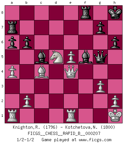 Last move : 1/2-1/2 2013 June 18 22:25:21 [Event "FICGS__CHESS__RAPID_B__000207"] [Site "FICGS"] [Date "2013.06.07"] [Round "1"] [White "Knighton,Robert"] [Black "Kotchetova,Nadezhda"] [Result "1/2-1/2"] [WhiteElo "1796"] [BlackElo "1800"] 1.d4 d5 2.c4 dxc4 3.e3 Nf6 4.Bxc4 e6 5.Qe2 c5 6.Nf3 a6 7.a4 cxd4 8.exd4 Nc6 9.Be3 Bd6 10.Nc3 O-O 11.O-O h6 12.Rfd1 Qe7 13.g3 Nb4 14.Ne5 b6 15.Ng4 Nxg4 16.Qxg4 Nc2 17.Qe4 Nxe3 18.Bd3 f5 19.Qxe3 Kh8 20.Re1 Ra7 21.Bc4 f4 22.Qe4 e5 23.Nd5 Qg5 24.dxe5 fxg3 25.fxg3 Bc5+ 26.Kh1 Bf5 1/2-1/2 Comment by player 1 : Robert Knighton : Good Game. The paths available to avoid triple repetition of moves which quickly approaches this position is risky for white and probably would still eventually end in a draw with risk of losing a drawn game. Queen's gambit accepted Kingside Castling by player Black (move 10) Kingside Castling by player White (move 11) This chess game ended in a draw. Follow this game move after move (download)Chess is really ninety nine percent calculation. (Soltis) Vom Schach wurde gesagt das Leben sei dafür nicht lange genug. Aber das ist der Fehler des Lebens, nicht des Schach'. (Irving Chernev) Durante una competencia de Ajedrez, un Maestro de Ajedrez deberá ser una combinación de presa de caza y un Monge. (Alexander Alekhine) Il s'avisa de me proposer d'apprendre les échecs qu'il jouait un peu... me voilà forcené des échecs. J'achète un échiquier, je m'enferme dans ma chambre, j'y passe des jours et des nuits à vouloir apprendre par cur toutes les parties. (Jean-Jacques Rousseau, Confessions) Watch your thoughts; they become words. Watch your words; they become actions. Watch your actions; they become habits. Watch your habits; they become character. Watch your character; it becomes your destiny. (Frank Outlaw)