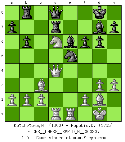 Last move : 1-0 2013 August 15 6:10:8 [Event "FICGS__CHESS__RAPID_B__000207"] [Site "FICGS"] [Date "2013.06.07"] [Round "1"] [White "Kotchetova,Nadezhda"] [Black "Ropokis,Dimitrios"] [Result "1-0"] [WhiteElo "1800"] [BlackElo "1795"] 1.e4 c5 2.Nc3 g6 3.g3 Bg7 4.Bg2 d6 5.d3 Nf6 6.Nf3 O-O 7.e5 Ng4 8.exd6 exd6 9.O-O Nc6 10.h3 Nge5 11.Nxe5 Nxe5 12.Re1 Rb8 13.Ne4 Re8 14.Bg5 f6 15.Be3 b6 16.d4 Nc4 17.Bf4 cxd4 18.Qxd4 Ne5 19.Nxd6 Re7 20.Rad1 Be6 21.Bd2 Rd7 22.Bc3 1-0 This chess game has been lost on time (started : 2013.06.07 11:21:36) Sicilian : Closed Kingside Castling by player Black (move 6) Kingside Castling by player White (move 9) Player White won this chess game. Follow this game move after move (download)When I have White, I win because I am white; When I have Black, I win because I am Bogolyubov. (Bogolyubov) Nur ein wirklich starker Spieler weiß wie schwach er spielt. (Savielly Grigorievitsch Tartakower) El jugador táctico debe saber que hacer cuando algo se debe de hacer. El estratégico debe saber que hacer cuando nada se debe de hacer. (Savielly Tartakover) Les Echecs sont affaire de jugement sensible. Savoir quand frapper et quand esquiver. (Fischer) My poor ole parrot... Is not in the circulation of displays ....poo hoo hoo :) (Wayne Lowrance's enigma)