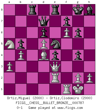 Last move : 0-1 2013 June 7 15:8:27 [Event "FICGS__CHESS__BULLET_BRONZE__000787"] [Site "FICGS"] [Date "2013.06.07"] [Round "1"] [White "Ortiz,Miguel"] [Black "Ortiz,Clodomiro"] [Result "0-1"] [WhiteElo "2000"] [BlackElo "2000"] 1.e4 c5 2.Nf3 d6 3.d4 cxd4 4.Nxd4 Nf6 5.Nc3 a6 6.f3 e5 7.Nb3 Be6 8.Be3 h5 9.Qd2 Nbd7 10.Nd5 Bxd5 11.exd5 g6 12.Be2 Bg7 13.O-O O-O 14.Na5 Qc7 15.c4 e4 16.f4 Ng4 17.Bxg4 hxg4 18.Rad1 Nc5 19.f5 Nd3 20.f6 Bh8 21.b4 Qd7 22.a3 b5 23.cxb5 axb5 24.Bd4 Rfe8 25.Qg5 Rac8 26.Rd2 Nc1 27.Qe3 Nd3 28.Re2 Ne5 0-1 Sicilian : Najdorf Kingside Castling by player White (move 13) Kingside Castling by player Black (move 13) Player Black won this chess game. Follow this game move after move (download)When you don't know what to play, wait for an idea to come into your opponent's mind. You may be sure that idea will be wrong. (Siegbert Tarrasch) Der Verteidiger gebe der Gewalt nach, aber nur der Gewalt. Er schaffe sich nicht freiwillig, etwa aus Blindheit oder aus Schrecken, irgendwelche Schwächen. Er lasse sich nicht bluffen. (Emanuel Lasker) El ganar no lo es todo... pero el perder es nada. (Mednis) Il n'y a pas de prix trop élevé au scalp de l'ennemi. (Koblentz) Art is the triumph over chaos. (John Cheever)