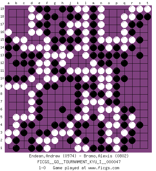Last move : 1-0 2013 September 10 18:27:20 [Event "FICGS__GO__TOURNAMENT_KYU_I__000047"] [Site "FICGS"] [Date "2013.06.08"] [Round "1"] [Black "Endean,Andrew"] [White "Bromo,Alexis"] [Result "1-0"] [Rating 1 "0974"] [Rating 2 "0802"] 1.q4 d16 2.d4 q16 3.q10 d10 4.k4 l16 5.f17 f15 6.h16 j17 7.h17 e18 8.e17 d17 9.g15 h14 10.g14 g13 11.j15 k14 12.j18 k17 13.k18 l18 14.g18 f14 15.f16 e16 16.j14 j13 17.h15 h13 18.h19 k19 19.j19 l19 20.f18 d18 21.r14 p13 22.q12 o10 23.p8 o8 24.o7 n7 25.n8 o9 26.p9 o6 27.p7 p6 28.q6 n6 29.m8 m7 30.l9 l11 31.k10 k11 32.j10 j11 33.h10 g10 34.g9 f10 35.f9 e9 36.e8 d8 37.e7 d7 38.e6 d6 39.e5 c5 40.c3 b4 41.c4 b5 42.h11 h12 43.g11 f11 44.g12 f12 45.r17 q17 46.r16 q14 47.q13 p12 48.p11 o11 49.p10 l10 50.k8 r15 51.s15 q15 52.s13 r18 53.s18 q18 54.k15 l15 55.k16 l17 56.e19 d19 57.f19 s19 58.t18 r19 59.m5 n5 60.n4 o4 61.n3 o3 62.n2 o2 63.o1 p1 64.n1 p2 65.r2 q3 66.r3 p4 67.q5 p5 68.q2 l7 69.k7 l6 70.k6 l5 71.l4 k5 72.j5 l8 73.m10 n9 74.m9 m11 75.p3 n10 76.k9 j4 77.h4 j3 78.h6 h3 79.g4 g3 80.f3 f2 81.e3 e2 82.d2 b3 83.b2 a2 84.b1 a3 85.e1 f1 86.d1 g2 87.k3 k2 88.l2 l1 89.m1 k1 90.j2 q3 91.q1 r4 92.s4 r5 93.r6 j16 94.p14 o14 95.o12 n11 96.o13 p15 97.p13 n13 98.n12 m12 99.n14 o15 100.m13 l13 101.m15 l14 102.m14 n15 103.m16 n16 104.m17 n17 105.m18 n18 106.m19 n19 107.n13 t19 108.s17 d5 109.c13 b13 110.b14 c15 111.b12 b15 112.a13 c14 113.d13 d14 114.e13 f13 115.c10 c9 116.b10 b9 117.a10 a9 118.d11 e11 119.c12 e12 120.d12 e14 121.a15 a16 122.a14 1-0 Here are the names of the openings (joseki) played in the four corners : Corner d16 : d16 f17 Hoshi (Hwajeom, Seongjeom, Xingwei`) 4-4 Point. The star or hoshi (4-4) point, emphasizing influence at the potential expense of territory. Ikken Kakari (Hankan Keolch'im, Yi Gua`jiao~, 1-Space Low Approach). Black 2 is the standard approach move to the 4-4. Player Black won this Go (weiqi, baduk) game. Follow this game move after move (download)Never try to cut bamboo joints. (Anonymous) Are you threatening me, Master Jedi ? (Chancellor Palpatine in Star Wars ep.3)