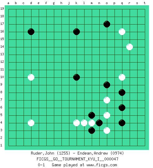 Last move : 0-1 2013 July 27 16:17:6 [Event "FICGS__GO__TOURNAMENT_KYU_I__000047"] [Site "FICGS"] [Date "2013.06.08"] [Round "1"] [Black "Ruder,John"] [White "Endean,Andrew"] [Result "0-1"] [Rating 1 "1255"] [Rating 2 "0974"] 1.d16 q16 2.q4 d4 3.k10 d10 4.o17 r14 5.k16 o3 6.m3 o5 7.q6 k4 8.m5 o7 9.q8 q10 10.o9 m4 11.n4 l4 0-1 This go game has been lost on time (started : 2013.06.08 1:44:14) Here are the names of the openings (joseki) played in the four corners : Corner q16 : q16 o17 Hoshi (Hwajeom, Seongjeom, Xingwei`) 4-4 Point. The star or hoshi (4-4) point, emphasizing influence at the potential expense of territory. Ikken Kakari (Hankan Keolch'im, Yi Gua`jiao~, 1-Space Low Approach). Black 2 is the standard approach move to the 4-4. Corner q4 : q4 o3 Hoshi (Hwajeom, Seongjeom, Xingwei`) 4-4 Point. The star or hoshi (4-4) point, emphasizing influence at the potential expense of territory. Ikken Kakari (Hankan Keolch'im, Yi Gua`jiao~, 1-Space Low Approach). White 2 is the standard approach move to the 4-4. Player White won this Go (weiqi, baduk) game. Follow this game move after move (download)Dead group ? Always win ko fights ! (Anonymous) No, I am still playing. (Anatoly Karpov)
