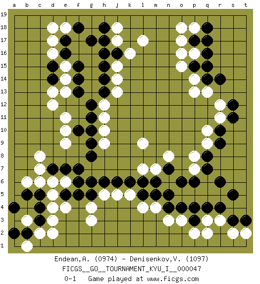 Last move : 0-1 2013 July 19 19:10:7 [Event "FICGS__GO__TOURNAMENT_KYU_I__000047"] [Site "FICGS"] [Date "2013.06.08"] [Round "1"] [Black "Endean,Andrew"] [White "Denisenkov,Valentin"] [Result "0-1"] [Rating 1 "0974"] [Rating 2 "1097"] 1.q4 d4 2.q16 d17 3.d15 d12 4.e17 d16 5.e16 e15 6.d14 e14 7.f15 d13 8.f14 e13 9.f13 l17 10.h16 o17 11.r14 o3 12.r6 q2 13.p3 p2 14.o4 n3 15.n4 r3 16.r4 m4 17.m5 l4 18.l5 k5 19.k6 j5 20.j6 h5 21.h6 q10 22.q8 q13 23.p17 o16 24.p15 o15 25.q14 p13 26.r10 q9 27.r9 r11 28.s11 r12 29.s12 n6 30.n5 l7 31.l6 l9 32.o6 p8 33.q7 p7 34.p6 n8 35.n7 m7 36.m6 j13 37.h14 j14 38.h13 h12 39.g12 h11 40.g11 h10 41.g10 c8 42.g8 g3 43.g5 g4 44.f5 d6 45.e7 e6 46.f7 e4 47.g6 h9 48.g9 e9 49.d7 c7 50.e5 d5 51.f6 j15 52.h15 j18 53.h17 j17 54.j16 k16 55.h18 e18 56.f18 d18 57.g17 e11 58.f10 e10 59.s3 q3 60.p4 s2 61.t3 t2 62.s5 p18 63.q18 p16 64.q17 p14 65.q15 o18 66.c3 d3 67.c4 c2 68.b2 d2 69.c5 b1 70.a2 b6 71.b5 c6 72.a4 b3 0-1 Here are the names of the openings (joseki) played in the four corners : Corner d16 : d17 d15 Komoku (Somok, Xiao~mu`) 3-4 Point. The komoku (3-4) point is the traditional corner enclosure move.. Ikken Takagakari (Hankan Nop'dakeolch'im, Yi Gaogua`jiao~, 1-Space High Approach). The 5-4 approach move has become more popular in modern times, as modern Go emphasizes speed and influence. Corner q16 : q16 l17 Hoshi (Hwajeom, Seongjeom, Xingwei`) 4-4 Point. The star or hoshi (4-4) point, emphasizing influence at the potential expense of territory. Corner q4 : q4 o3 Hoshi (Hwajeom, Seongjeom, Xingwei`) 4-4 Point. The star or hoshi (4-4) point, emphasizing influence at the potential expense of territory. Ikken Kakari (Hankan Keolch'im, Yi Gua`jiao~, 1-Space Low Approach). White 2 is the standard approach move to the 4-4. Player White won this Go (weiqi, baduk) game. Follow this game move after move (download)Don't defend - extend ! (Bill Taylor) A good programmer is someone who always looks both ways before crossing a one-way street. (Doug Linder)