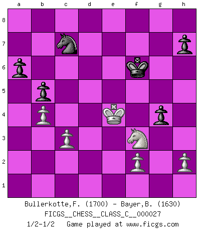 Last move : 1/2-1/2 2007 August 18 20:43:5 [Event "FICGS__CHESS__CLASS_C__000027"] [Site "FICGS"] [Date "2007.02.01"] [Round "1"] [White "Bullerkotte,Frank"] [Black "Bayer,Bernhard"] [Result "1/2-1/2"] [WhiteElo "1700"] [BlackElo "1630"] 1.e4 c5 2.Nf3 d6 3.d4 cxd4 4.Nxd4 Nf6 5.Nc3 a6 6.Be2 e5 7.Nb3 Be7 8.O-O Nc6 9.Be3 O-O 10.Qd2 Nxe4 11.Nxe4 d5 12.Qd3 dxe4 13.Qxe4 f5 14.Qc4+ Kh8 15.Rad1 Qc7 16.Bc5 Bxc5 17.Qxc5 Be6 18.Rd6 Bg8 19.c3 Rfd8 20.Rfd1 Rxd6 21.Qxd6 Qxd6 22.Rxd6 Rd8 23.Rxd8 Nxd8 24.g4 fxg4 25.Bxg4 g5 26.Nc5 Bxa2 27.Bf3 Kg7 28.b4 b6 29.Nd7 b5 30.Nxe5 Ne6 31.Kf1 Nc7 32.Ke2 Bd5 33.Kd3 Bxf3 34.Nxf3 Kf6 35.Ke4 g4 1/2-1/2 Sicilian : Najdorf, Opovcensky variation Kingside Castling by player White (move 8) Kingside Castling by player Black (move 9) This chess game ended in a draw. Follow this game move after move (download)In life, as in Chess, one's own Pawns block one's way. A man's very wealth, ease, leisure, children, books, which should help him to win, more often checkmate him. (Charles Buxton) Im Internet Chess Club betrug mein Rating vorübergehend 3350 ELO-Punkte. (Sergej Karjakin) El pensamiento metódico es mas útil en el Ajedrez que la inspiración. (C. J. S. Purdy) La vie est comme un jeu d'échecs : nous esquissons un plan, mais celui-ci est tributaire de ce que daignent faire l'adversaire aux échecs et le destin dans la vie. (Arthur Schopenhauer) He who is a good ruler must first have been ruled. (Aristotle)