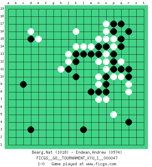 Last move : 1-0 2013 July 24 12:47:25 [Event "FICGS__GO__TOURNAMENT_KYU_I__000047"] [Site "FICGS"] [Date "2013.06.08"] [Round "1"] [Black "Bearg,Nat"] [White "Endean,Andrew"] [Result "1-0"] [Rating 1 "1018"] [Rating 2 "0974"] 1.d3 q16 2.r4 d16 3.c9 q10 4.l3 k16 5.k10 p5 6.d15 e15 7.r10 r9 8.r11 r8 9.q15 p15 10.q14 p14 11.p16 o16 12.p17 o17 13.q17 n15 14.r16 q12 15.q11 p10 16.p11 o11 17.p12 o12 18.p13 o13 19.n14 m14 20.n13 n12 21.m13 l14 22.l13 k14 23.k13 j13 24.o14 o15 25.o10 n10 26.o9 n9 27.o8 o7 28.n8 n7 29.m8 h11 30.j11 j12 31.k12 1-0 Here are the names of the openings (joseki) played in the four corners : Corner d16 : d16 d15 Hoshi (Hwajeom, Seongjeom, Xingwei`) 4-4 Point. The star or hoshi (4-4) point, emphasizing influence at the potential expense of territory. Corner q16 : q16 r11 Hoshi (Hwajeom, Seongjeom, Xingwei`) 4-4 Point. The star or hoshi (4-4) point, emphasizing influence at the potential expense of territory. Player Black won this Go (weiqi, baduk) game. Follow this game move after move (download)There is damezumari at the bamboo joint. (Anonymous) Indecision is the key to flexibility. (Unknown)