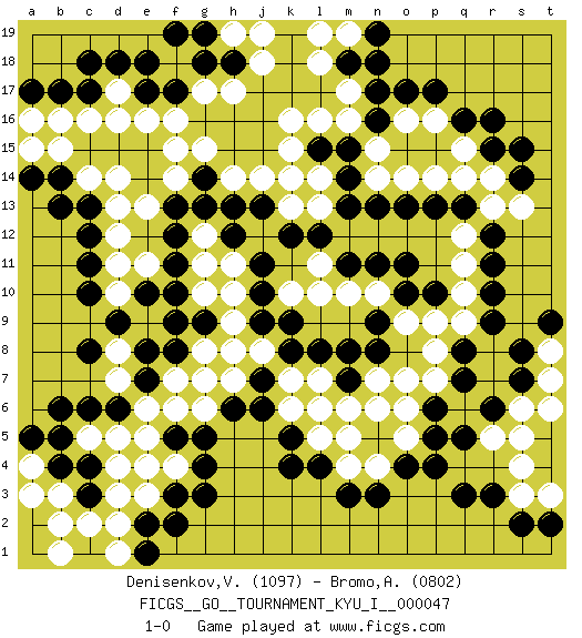 Last move : 1-0 2013 June 19 18:48:11 [Event "FICGS__GO__TOURNAMENT_KYU_I__000047"] [Site "FICGS"] [Date "2013.06.08"] [Round "1"] [Black "Denisenkov,Valentin"] [White "Bromo,Alexis"] [Result "1-0"] [Rating 1 "1097"] [Rating 2 "0802"] 1.q16 d4 2.q3 d16 3.r9 k10 4.c10 d10 5.d9 d11 6.c6 c5 7.d6 d5 8.c3 d3 9.b5 c2 10.b4 b3 11.c4 b2 12.k4 k16 13.f17 f15 14.d18 h17 15.c17 c16 16.b17 b16 17.f9 g8 18.g9 h9 19.f8 f7 20.g7 h8 21.e7 f6 22.f12 g10 23.f10 g11 24.f11 g12 25.c11 d12 26.c12 d13 27.f13 e13 28.g14 f14 29.g13 g15 30.q5 p7 31.q7 p8 32.q8 q10 33.r10 q11 34.r11 q12 35.r12 r13 36.q13 q14 37.p13 p14 38.o13 o14 39.n13 n14 40.r15 r14 41.m13 l13 42.m14 l14 43.m15 n15 44.n16 o16 45.l12 l11 46.k12 k13 47.j13 j14 48.l15 k14 49.h12 h11 50.j11 h10 51.m11 m10 52.n11 n10 53.o10 o9 54.p10 p9 55.o11 q9 56.o17 p16 57.p17 q15 58.r16 m16 59.n17 m17 60.s14 s13 61.s15 l16 62.m3 n4 63.n3 m4 64.l4 l5 65.k5 k6 66.l6 m5 67.j6 k7 68.j7 j8 69.k8 l7 70.j10 h7 71.h6 g6 72.j9 g7 73.g4 e5 74.e2 d2 75.f3 d1 76.k9 l10 77.m7 m6 78.l8 l6 79.n8 n7 80.m8 o7 81.n9 n6 82.o4 o5 83.p6 o6 84.p4 h14 85.h13 k15 86.b14 c14 87.b13 b15 88.g18 g17 89.h18 j18 90.e17 f16 91.b6 f4 92.g5 a3 93.e1 b1 94.f5 e6 95.e4 e3 96.f2 f4 97.g3 a4 98.a5 e4 99.m18 l18 100.n18 d7 101.e8 d8 102.c8 d17 103.c18 e16 104.a17 a16 105.c13 d14 106.e10 e11 107.f19 h19 108.e18 j19 109.g19 m19 110.n19 l19 111.a14 a15 112.pass s4 113.r3 s3 114.s2 s5 115.r6 s6 116.s7 r5 117.p5 t7 118.s8 t8 119.t9 t6 120.t2 t3 121.pass 1-0 Here are the names of the openings (joseki) played in the four corners : Corner d4 : d4 d9 Hoshi (Hwajeom, Seongjeom, Xingwei`) 4-4 Point. The star or hoshi (4-4) point, emphasizing influence at the potential expense of territory. Corner q16 : q16 q11 Hoshi (Hwajeom, Seongjeom, Xingwei`) 4-4 Point. The star or hoshi (4-4) point, emphasizing influence at the potential expense of territory. Player Black won this Go (weiqi, baduk) game. Follow this game move after move (download)Answer the keima with a kosumi. (Anonymous) Without enthusiasm, virtue functions not at all, and vice only poorly. (Mignon McLaughlin, The Neurotic's Notebook, 1960)