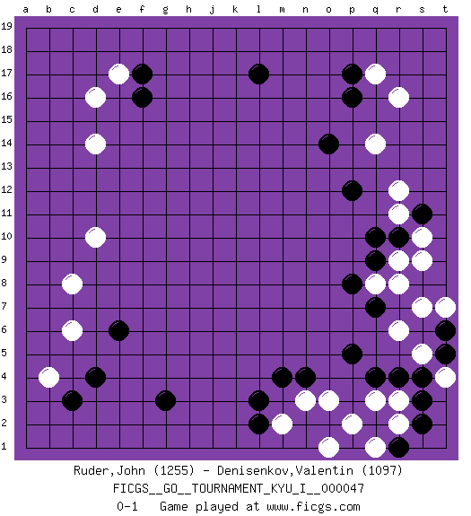 Last move : 0-1 2013 August 12 6:8:37 [Event "FICGS__GO__TOURNAMENT_KYU_I__000047 "] [Site "FICGS"] [Date "2013.06.08"] [Round "1"] [Black "Ruder,John "] [White "Denisenkov,Valentin "] [Result "0-1"] [Rating 1 "1255"] [Rating 2 "1097"] 1.q4 d16 2.d4 r16 3.p16 q17 4.p17 q14 5.l17 c6 6.g3 b4 7.c3 d10 8.e6 c8 9.f17 e17 10.f16 d14 11.q10 o3 12.l3 r6 13.p5 r3 14.r4 q3 15.n4 n3 16.m4 r9 17.r10 s10 18.s11 s9 19.q9 q8 20.p8 s5 21.s4 s7 22.q7 r8 23.s2 t4 24.s3 m2 25.l2 r2 26.p1 p2 27.r1 q1 28.q2 r11 29.p12 r12 30.o14 q1 31.t6 o1 32.t5 t7 0-1 This go game has been lost on time (started : 2013.06.08 1:44:14) Here are the names of the openings (joseki) played in the four corners : Corner q16 : r16 p16Komoku (Somok, Xiao~mu`) 3-4 Point. The komoku (3-4) point is the traditional corner enclosure move..Ikken Takagakari (Hankan Nop'dakeolch'im, Yi Gaogua`jiao~, 1-Space High Approach). The 5-4 approach move has become more popular in modern times, as modern Go emphasizes speed and influence. Corner d4 : d4 c6Hoshi (Hwajeom, Seongjeom, Xingwei`) 4-4 Point. The star or hoshi (4-4) point, emphasizing influence at the potential expense of territory.Ikken Kakari (Hankan Keolch'im, Yi Gua`jiao~, 1-Space Low Approach). White 2 is the standard approach move to the 4-4. Corner d16 : d16 f17Hoshi (Hwajeom, Seongjeom, Xingwei`) 4-4 Point. The star or hoshi (4-4) point, emphasizing influence at the potential expense of territory.Ikken Kakari (Hankan Keolch'im, Yi Gua`jiao~, 1-Space Low Approach). Black 2 is the standard approach move to the 4-4. Corner q4 : q4 o3Hoshi (Hwajeom, Seongjeom, Xingwei`) 4-4 Point. The star or hoshi (4-4) point, emphasizing influence at the potential expense of territory.Ikken Kakari (Hankan Keolch'im, Yi Gua`jiao~, 1-Space Low Approach). White 2 is the standard approach move to the 4-4. Player White won this Go (weiqi, baduk) game.Follow this game move after move (download ) Go is to western chess what philosophy is to double entry accounting. (from Shibumi, by Trevanian) Fear is the path to the dark side. Fear leads to anger; anger leads to hate; hate leads to suffering. I sense much fear in you. (Master Yoda in Star Wars ep.1)