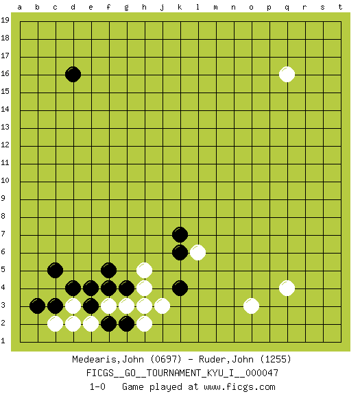 Last move : 1-0 2013 August 6 5:13:51 [Event "FICGS__GO__TOURNAMENT_KYU_I__000047"] [Site "FICGS"] [Date "2013.06.08"] [Round "1"] [Black "Medearis,John"] [White "Ruder,John"] [Result "1-0"] [Rating 1 "0697"] [Rating 2 "1255"] 1.c5 q4 2.d16 q16 3.k4 d3 4.c3 c2 5.b3 g3 6.f5 h5 7.g4 h4 8.h3 f3 9.f4 j3 10.g2 h2 11.d4 e2 12.e4 o3 13.e3 d2 14.f2 h3 15.k7 l6 16.k6 1-0 This go game has been lost on time (started : 2013.06.08 1:44:14) Here are the names of the openings (joseki) played in the four corners : Corner d4 : c5 d3 Mokuhazushi (Waemok, Wai`mu`) 5-3 Point. The mokuhazushi (5-3) point was popular in the Edo period in Japan (1600 - 1867). It emphasizes influence; territorially, it is inferior to the 3-4 point. Komoku Kakari. White 2 is the standard approach because of its solidity and stability. Player Black won this Go (weiqi, baduk) game. Follow this game move after move (download)Don't count territory held by only one eye. (Anonymous) What doesn't kill us makes us stronger. (Friedrich Nietzsche)