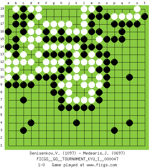 Last move : 1-0 2013 August 11 22:55:41 [Event "FICGS__GO__TOURNAMENT_KYU_I__000047"] [Site "FICGS"] [Date "2013.06.08"] [Round "1"] [Black "Denisenkov,Valentin"] [White "Medearis,John"] [Result "1-0"] [Rating 1 "1097"] [Rating 2 "0697"] 1.q17 c15 2.d4 e16 3.c17 d17 4.c16 d15 5.b15 c18 6.b18 b19 7.d18 b16 8.b17 e18 9.c19 a15 10.b14 e19 11.r4 d19 12.c18 d16 13.p3 k16 14.r10 d10 15.d13 c13 16.b13 c12 17.c7 e13 18.q15 d12 19.b10 d14 20.k4 k10 21.m16 b12 22.a16 a13 23.a14 a12 24.j13 k13 25.g10 g11 26.h11 g12 27.f10 f11 28.e10 e11 29.d9 c10 30.c9 b11 31.h10 h12 32.j12 k12 33.j11 k11 34.o10 j8 35.g8 j9 36.h6 n9 37.o9 n10 38.n8 m8 39.n7 m7 40.m6 k7 41.l6 l7 42.k6 l9 43.n13 o12 44.o11 n12 45.n11 m11 46.m10 m9 47.m12 l10 48.p12 m13 49.o13 l12 50.m14 n12 51.j15 k14 52.k15 j17 53.l15 l18 54.m18 l17 55.m17 l16 56.g15 g16 57.h16 h17 58.f16 g17 59.f15 f17 60.g13 j16 61.h15 h14 62.h13 j14 63.f13 f12 64.c3 g14 65.b9 f14 66.l14 e15 67.h7 j7 68.j6 h9 69.g9 m19 70.n19 l19 71.o18 n15 72.n14 o16 73.p15 o17 74.n16 n17 75.n18 p18 76.p17 q18 77.r17 r18 78.s17 s18 79.t18 p16 80.o15 a10 81.a9 a11 82.l13 m12 83.o12 j10 84.h8 s19 85.q16 pass 86.pass 1-0 Here are the names of the openings (joseki) played in the four corners : Player Black won this Go (weiqi, baduk) game. Follow this game move after move (download)Don't be greedy ! (Anonymous) Don't be irreplaceable, if you can't be replaced, you can't be promoted. (Dan Rotaru)