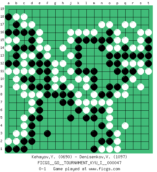 Last move : 0-1 2013 July 5 11:48:18 [Event "FICGS__GO__TOURNAMENT_KYU_I__000047"] [Site "FICGS"] [Date "2013.06.08"] [Round "1"] [Black "Kehayov,Yulian"] [White "Denisenkov,Valentin"] [Result "0-1"] [Rating 1 "0690"] [Rating 2 "1097"] 1.c16 q4 2.d3 q17 3.r16 r17 4.q16 p16 5.q14 r12 6.p13 p15 7.o12 q15 8.r15 r14 9.r13 s14 10.s13 s16 11.r11 s12 12.t13 q12 13.q13 s11 14.q11 s9 15.p12 r10 16.q10 q9 17.p9 p8 18.o9 q8 19.o8 e16 20.d14 j16 21.n15 n17 22.f3 c9 23.e9 c5 24.d5 d6 25.e5 c4 26.d4 c12 27.d12 c13 28.c14 d13 29.e13 e14 30.e12 d11 31.e11 f14 32.d10 c11 33.c10 b10 34.d9 c8 35.e6 d7 36.e7 k10 37.k12 k8 38.k6 l7 39.l5 o7 40.n8 l6 41.m5 n7 42.m11 m8 43.m9 e8 44.f8 d8 45.f10 g9 46.f9 h10 47.h7 h12 48.k14 l16 49.o3 p3 50.o2 o4 51.n4 p2 52.m3 o5 53.l15 m16 54.m15 o14 55.n14 h14 56.o13 c3 57.c2 b2 58.d2 c17 59.b17 d17 60.d16 e15 61.d15 b15 62.b14 b11 63.b16 b18 64.a18 a17 65.a16 c18 66.b13 a15 67.b12 a14 68.a12 b9 69.g8 h8 70.j8 j9 71.j7 l9 72.m10 k7 73.j5 a11 74.h9 g10 75.h8 j13 76.k13 j15 77.t14 s15 78.t15 t16 79.t12 t11 80.p11 o1 81.n2 n1 82.m1 p1 83.b1 a2 84.c1 j11 85.k11 l10 86.l11 g12 87.f12 f13 88.o15 p14 89.o16 o17 90.k15 k16 91.a1 b3 92.n6 o6 93.m6 m7 94.pass g11 95.f11 pass 0-1 Here are the names of the openings (joseki) played in the four corners : Corner q16 : q17 r16 Komoku (Somok, Xiao~mu`) 3-4 Point. The komoku (3-4) point is the traditional corner enclosure move.. Corner d16 : c16 e16 Komoku (Somok, Xiao~mu`) 3-4 Point. The komoku (3-4) point is the traditional corner enclosure move.. Ikken Takagakari (Hankan Nop'dakeolch'im, Yi Gaogua`jiao~, 1-Space High Approach). The 5-4 approach move has become more popular in modern times, as modern Go emphasizes speed and influence. Player White won this Go (weiqi, baduk) game. Follow this game move after move (download)In an unreasonable situation, an unreasonable move is reasonable. (Tamino) The best teachers teach from the heart, not from the book. (Author unknown)