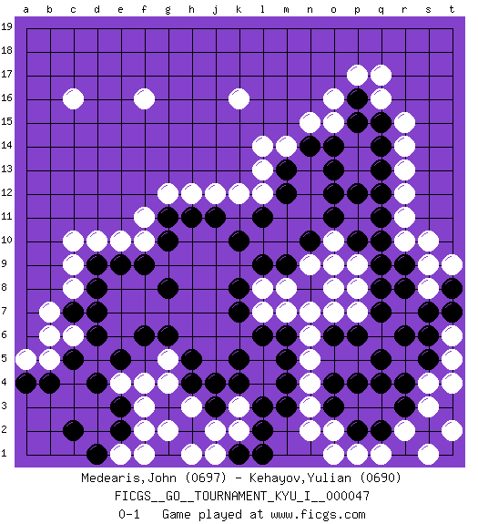 Last move : 0-1 2013 November 4 2:7:43 [Event "FICGS__GO__TOURNAMENT_KYU_I__000047"] [Site "FICGS"] [Date "2013.06.08"] [Round "1"] [Black "Medearis,John"] [White "Kehayov,Yulian"] [Result "0-1"] [Rating 1 "0697"] [Rating 2 "0690"] 1.q4 c16 2.d4 q17 3.q10 d10 4.k4 k16 5.k10 f16 6.d7 r13 7.p12 n7 8.q14 r15 9.q13 r14 10.o14 n4 11.m5 n5 12.m4 n3 13.q7 g12 14.g10 k12 15.n10 g4 16.h5 g5 17.h4 h3 18.k5 m7 19.l6 l7 20.k7 l8 21.k8 k3 22.l3 k2 23.l2 f3 24.e2 f2 25.e3 f4 26.j3 j2 27.j4 g2 28.f6 c8 29.d8 c9 30.f9 f11 31.g11 h12 32.h11 j12 33.j11 n15 34.n14 o15 35.p15 o16 36.q15 q16 37.p16 p17 38.o13 l14 39.m13 m14 40.o12 r12 41.q12 r11 42.q11 r10 43.r9 s9 44.r8 s8 45.s7 c6 46.c7 b7 47.d9 e10 48.e9 f10 49.g8 p3 50.p4 q3 51.r3 r2 52.s2 s3 53.r4 s1 54.o3 o2 55.o4 p1 56.q2 t2 57.p2 q1 58.m6 n6 59.l9 n2 60.m3 o1 61.l1 h1 62.c5 b5 63.d6 b6 64.b4 a5 65.a4 c10 66.k1 j1 67.g6 e1 68.d1 f1 69.c2 l12 70.m12 l13 71.l11 o8 72.o9 p8 73.q8 p7 74.p6 p9 75.p10 n9 76.q9 o10 77.m9 m8 78.o11 o9 79.o6 o7 80.q5 s4 81.s5 t5 82.r6 t6 83.t7 s10 84.t8 t9 85.s6 t4 86.e5 e4 0-1 Here are the names of the openings (joseki) played in the four corners : Corner q4 : q4 n7 Hoshi (Hwajeom, Seongjeom, Xingwei`) 4-4 Point. The star or hoshi (4-4) point, emphasizing influence at the potential expense of territory. Player White won this Go (weiqi, baduk) game. Follow this game move after move (download)Go is to western chess what philosophy is to double entry accounting. (from Shibumi, by Trevanian) Good decisions come from experience, and experience comes from bad decisions. (Anonymous)