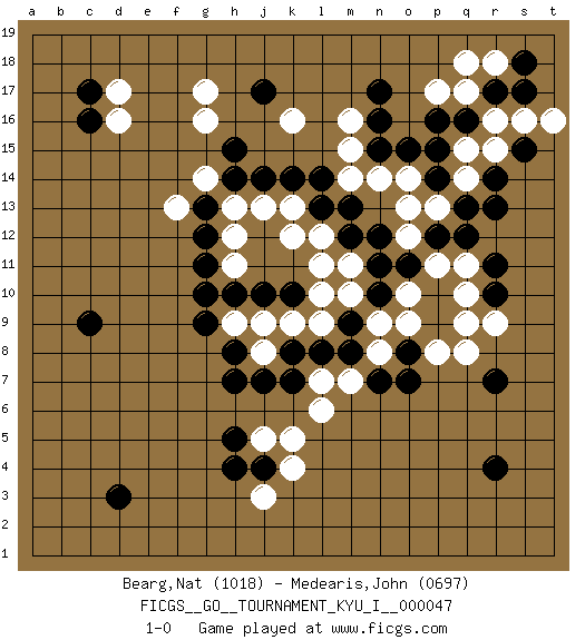Last move : 1-0 2013 October 2 6:38:58 [Event "FICGS__GO__TOURNAMENT_KYU_I__000047"] [Site "FICGS"] [Date "2013.06.08"] [Round "1"] [Black "Bearg,Nat"] [White "Medearis,John"] [Result "1-0"] [Rating 1 "1018"] [Rating 2 "0697"] 1.d3 d17 2.r4 r16 3.c9 q10 4.j17 j3 5.k10 k13 6.j4 k4 7.c16 d16 8.c17 g17 9.q16 q15 10.p16 r15 11.r10 r9 12.r11 q9 13.l13 l12 14.m13 k12 15.h14 g16 16.o11 p11 17.p12 q11 18.q12 o10 19.n11 m11 20.m12 m10 21.n10 l11 22.m9 o9 23.o8 n9 24.m8 l9 25.k7 k9 26.j10 j9 27.h10 h9 28.g9 l10 29.k14 j13 30.j14 h13 31.g13 g14 32.g12 f13 33.g11 h11 34.g10 h12 35.h8 o12 36.n12 o13 37.p14 p13 38.q13 o14 39.p15 q14 40.r13 q17 41.r17 p17 42.o15 n14 43.n15 p8 44.o7 q8 45.r7 m14 46.l14 m15 47.n16 m16 48.n17 r18 49.s17 s16 50.s18 q18 51.r14 t16 52.s15 k16 53.h15 j8 54.j7 n8 55.n7 m7 56.l8 l6 57.k8 l7 58.h7 j5 59.h4 k5 60.h5 1-0 Here are the names of the openings (joseki) played in the four corners : Corner d16 : d17 j17 Komoku (Somok, Xiao~mu`) 3-4 Point. The komoku (3-4) point is the traditional corner enclosure move.. Corner q16 : r16 q16 Komoku (Somok, Xiao~mu`) 3-4 Point. The komoku (3-4) point is the traditional corner enclosure move.. Corner q4 : r4 r9 Komoku (Somok, Xiao~mu`) 3-4 Point. The komoku (3-4) point is the traditional corner enclosure move.. Player Black won this Go (weiqi, baduk) game. Follow this game move after move (download)Don't count territory held by only one eye. (Anonymous) When a man with money meets a man with experience, the man with experience leaves with money and the man with money leaves with experience. (Anonymous)