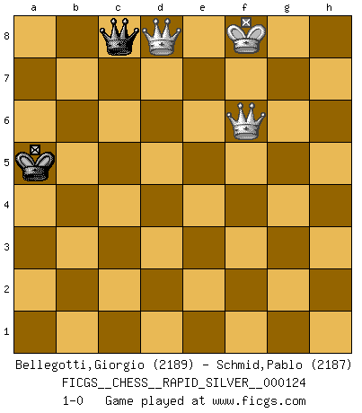 Last move : 1-0 2013 October 18 16:9:9 [Event "FICGS__CHESS__RAPID_SILVER__000124"] [Site "FICGS"] [Date "2013.06.08"] [Round "2"] [White "Bellegotti,Giorgio"] [Black "Schmid,Pablo"] [Result "1-0"] [WhiteElo "2189"] [BlackElo "2187"] 1.e4 c5 2.Nf3 d6 3.d4 cxd4 4.Nxd4 Nf6 5.Nc3 g6 6.Be3 Bg7 7.f3 O-O 8.Qd2 Nc6 9.Bc4 Nxd4 10.Bxd4 Be6 11.Bb3 Qa5 12.O-O-O Rfc8 13.Kb1 b5 14.Rhe1 Bxb3 15.cxb3 b4 16.Bxf6 bxc3 17.Bxc3 Bxc3 18.bxc3 Rxc3 19.Re3 Rac8 20.Rxc3 Qxc3 21.Qxc3 Rxc3 22.Rc1 Rxc1+ 23.Kxc1 Kf8 24.Kc2 Ke8 25.Kc3 Kd7 26.Kc4 Kc6 27.h4 h6 28.b4 Kb6 29.a4 e6 30.g3 Ka6 31.f4 Kb6 32.a5+ Ka6 33.g4 Kb7 34.b5 Kc7 35.f5 Kd7 36.f6 g5 37.h5 Kc7 38.Kd4 Kd8 39.e5 d5 40.Kc5 Kd7 41.b6 axb6+ 42.Kxb6 Kc8 43.Kc5 Kb7 44.Kd6 d4 45.Ke7 d3 46.Kxf7 d2 47.Kg7 d1Q 48.f7 Qxg4 49.f8Q Qe4 50.Qd6 Qf5 51.Qb6+ Ka8 52.Qd8+ Kb7 53.Qf6 g4 54.Qxf5 exf5 55.e6 g3 56.e7 g2 57.e8Q g1Q+ 58.Kxh6 Qb1 59.Qd7+ Kb8 60.Qd6+ Ka8 61.Qc6+ Kb8 62.Kg5 Qg1+ 63.Kxf5 Qf1+ 64.Kg5 Qg1+ 65.Kh6 Qe3+ 66.Kh7 Qd3+ 67.Qg6 Qd7+ 68.Kh8 Qc8+ 69.Qg8 Ka7 70.h6 Qc5 71.Qg6 Qf8+ 72.Kh7 Qf4 73.a6 Qf2 74.Kg8 Qh4 75.h7 Qd8+ 76.Kg7 Qd4+ 77.Kf7 Qf4+ 78.Qf6 Qc4+ 79.Qe6 Qf4+ 80.Kg7 Qg3+ 81.Kf8 Qc3 82.Qe7+ Kxa6 83.Kf7 Kb5 84.Qe8+ Ka5 85.h8Q Qf3+ 86.Qf6 Qh5+ 87.Kf8 Qc5+ 88.Qe8e7 Qc8+ 89.Qe7d8+ 1-0 Sicilian : Dragon, Yugoslav attack, 7...O-O Kingside Castling by player Black (move 7) Queenside Castling by player White (move 12) Promotion Queen by player Black (move 47) 10 pieces endgame at move 48 : White KPPPP , Black KQPPP WHITE : King + 4 Pawns BLACK : King + 1 Queen 3 Pawns Promotion Queen by player White (move 49) 9 pieces endgame at move 54 : White KQPPP , Black KPPP WHITE : King + 1 Queen 3 Pawns BLACK : King + 3 Pawns 8 pieces endgame at move 54 : White KPPP , Black KPPP WHITE : King + 3 Pawns BLACK : King + 3 Pawns Promotion Queen by player White (move 57) Promotion Queen by player Black (move 57) 7 pieces endgame at move 58 : White KQPP , Black KQP WHITE : King + 1 Queen 2 Pawns BLACK : King + 1 Queen 1 Pawn 6 pieces endgame at move 63 : White KQPP , Black KQ WHITE : King + 1 Queen 2 Pawns BLACK : King + 1 Queen 5 pieces endgame at move 82 : White KQP , Black KQ WHITE : King + 1 Queen 1 Pawn BLACK : King + 1 Queen Promotion Queen by player White (move 85) Player White won this chess game. Follow this game move after move (download)When you don't know what to do, wait for your opponent to get an idea - it's sure to be wrong. (Tarrasch) Es ist peinlich, dass ich nie Weltmeister wurde. Es wäre leicht, Leonid Breschnjew als Ursache vorzuschieben, dessen Apparat den Vorzeigekommunisten Anatoli Karpow in allem unterstützte. Aber Garri Kasparow zum Beispiel, der ebenfalls von den Sowjets unerwünscht war, hat trotz der Widerstände den WM-Titel erobert. (Viktor Kortschnoi) Ciertamente el estado mental actual de Bobby Fischer es una tragedia. Uno de los mas grandes jugadores de Ajedrez del mundo -el orgullo y pena del Ajedrez Americano. (Frank Brady) Si rien de grave n'est détecté lors de l'analyse d'une position, on joue alors le coup. Seconde règle de Blumenfeld. Perfection is achieved, not when there is nothing more to add, but when there is nothing left to take away. (Antoine de Saint-Exupéry)