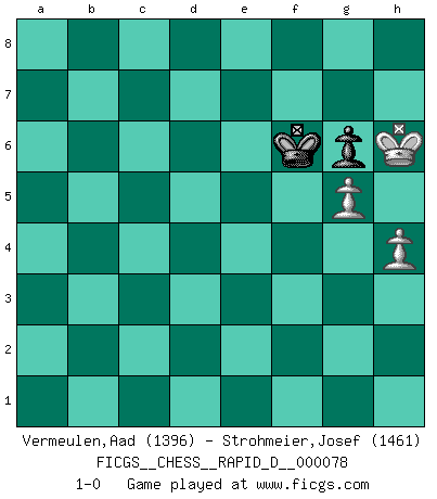 Last move : 1-0 2014 January 6 9:42:1 [Event "FICGS__CHESS__RAPID_D__000078"] [Site "FICGS"] [Date "2013.06.09"] [Round "1"] [White "Vermeulen,Aad"] [Black "Strohmeier,Josef"] [Result "1-0"] [WhiteElo "1396"] [BlackElo "1461"] 1.d4 Nf6 2.c4 e6 3.Nf3 b6 4.g3 Bb7 5.Bg2 Bb4+ 6.Bd2 Bxd2+ 7.Nbxd2 d5 8.O-O Nbd7 9.Re1 O-O 10.cxd5 exd5 11.b4 Rc8 12.Rb1 Re8 13.a4 a6 14.e3 Rb8 15.Nb3 Qe7 16.Nc1 Ne4 17.Ne2 c5 18.bxc5 bxc5 19.dxc5 Ndxc5 20.Nfd4 g6 21.f3 Nf6 22.Nf4 Qd7 23.Nd3 Nxa4 24.Qd2 Qd6 25.Qa5 Bc6 26.Nxc6 Qxc6 27.Nb4 Qb5 28.Qxb5 axb5 29.Nd3 Nd7 30.Kf2 Nac5 31.Nxc5 Nxc5 32.Red1 Red8 33.Rb4 Na6 34.Rbd4 b4 35.Rxd5 Rxd5 36.Rxd5 b3 37.Rd1 b2 38.Rb1 Nc5 39.Ke2 Na4 40.Kd2 Rb3 41.e4 Nc3 42.Kc2 Nxb1 43.Kxb3 Nd2+ 44.Kxb2 Nc4+ 45.Kc3 Ne3 46.Bh3 Kg7 47.Kd3 Nd1 48.Bd7 Kf6 49.Bb5 Ke5 50.f4+ Kd6 51.e5+ Ke7 52.Kd4 Nf2 53.Be2 h5 54.Kd5 Nh3 55.Bd3 Nf2 56.Be2 Ng4 57.Bxg4 hxg4 58.Kc5 Ke6 59.Kc4 f6 60.Kd4 fxe5+ 61.fxe5 Ke7 62.Ke4 Ke6 63.Kf4 Kd5 64.Kg5 Kxe5 65.Kxg4 Kf6 66.h4 Kf7 67.Kg5 Kg7 68.g4 Kf7 69.Kh6 Kf6 70.g5+ 1-0 Queen's Indian : Capablanca variation Kingside Castling by player White (move 8) Kingside Castling by player Black (move 9) 10 pieces endgame at move 57 : White KBPPPP , Black KPPP WHITE : King + 1 Bishop 4 Pawns BLACK : King + 3 Pawns 9 pieces endgame at move 57 : White KPPPP , Black KPPP WHITE : King + 4 Pawns BLACK : King + 3 Pawns 8 pieces endgame at move 60 : White KPPP , Black KPPP WHITE : King + 3 Pawns BLACK : King + 3 Pawns 7 pieces endgame at move 61 : White KPPP , Black KPP WHITE : King + 3 Pawns BLACK : King + 2 Pawns 6 pieces endgame at move 64 : White KPP , Black KPP WHITE : King + 2 Pawns BLACK : King + 2 Pawns 5 pieces endgame at move 65 : White KPP , Black KP WHITE : King + 2 Pawns BLACK : King + 1 Pawn Player White won this chess game. Follow this game move after move (download)Good offense and good defense both begin with good development. (Bruce A. Moon) Im Fernschach kannst du während dem Spiel rauchen. (John Christen Knudsen) Tu no necesitas jugar muy bien, únicamente ayudar a tu oponenet a que juegue muy mal. (Genrikh Chepukaitis) Une platitude souvent récitée à propos des Echecs est qu'une des choses les plus difficiles à réaliser est de gagner une position gagnante. Cela ne manque pas de sens mais, pour ma part, j'ai toujours trouvé plus difficile de gagner une position perdante. (Tim Krabbe) The only thing that overcomes hard luck is hard work. (Harry Golden)