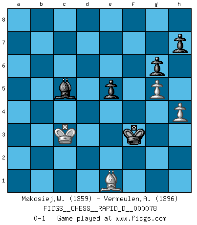Last move : 0-1 2013 October 30 19:46:33 [Event "FICGS__CHESS__RAPID_D__000078"] [Site "FICGS"] [Date "2013.06.09"] [Round "1"] [White "Makosiej,Wladyslaw"] [Black "Vermeulen,Aad"] [Result "0-1"] [WhiteElo "1359"] [BlackElo "1396"] 1.d4 Nf6 2.c4 g6 3.Nc3 d5 4.cxd5 Nxd5 5.e4 Nxc3 6.bxc3 Bg7 7.Bg5 c5 8.Rc1 cxd4 9.cxd4 O-O 10.Nf3 Bg4 11.d5 Qa5+ 12.Qd2 Qxd2+ 13.Nxd2 f6 14.Be3 Rc8 15.Nb3 Rxc1+ 16.Bxc1 Bc8 17.Bc4 Kf8 18.Ke2 Nd7 19.Rd1 Ne5 20.Bd3 Nxd3 21.Rxd3 b6 22.Ba3 Ba6 23.Nd4 Bxd3+ 24.Kxd3 Kf7 25.Nc6 Bf8 26.f4 Ke8 27.e5 a6 28.g4 Rc8 29.h4 fxe5 30.fxe5 Rxc6 31.dxc6 Kd8 32.Ke4 Kc7 33.e6 Kxc6 34.Bb4 Kb5 35.Bc3 Kc4 36.Be5 b5 37.Bd4 b4 38.Bb6 Kb5 39.Bc7 a5 40.Kd3 a4 41.g5 Kc5 42.Be5 Kd5 43.Bb2 b3 44.axb3 axb3 45.Bd4 Kxe6 46.Kc3 Kd5 47.Bf2 Ke4 48.Kxb3 e5 49.Kc3 Kf3 50.Be1 Bc5 0-1 King's Indian defense, 3.Nc3 Kingside Castling by player Black (move 9) 10 pieces endgame at move 45 : White KBPP , Black KBPPPP WHITE : King + 1 Bishop 2 Pawns BLACK : King + 1 Bishop 4 Pawns 9 pieces endgame at move 48 : White KBPP , Black KBPPP WHITE : King + 1 Bishop 2 Pawns BLACK : King + 1 Bishop 3 Pawns Player Black won this chess game. Follow this game move after move (download)Adequate compensation for a sacrifice is having a sound combination leading to a winning position; adequate compensation for a blunder is having your opponent snatch defeat from the jaws of victory. (Bruce A. Moon) Im Spitzenschach von heute geht es nur um Vorbereitung, um tiefgründige, sorgfältige Eröffnungsvorbereitung. (Nigel Short) La mitad de las variaciones que son calculadas en una partida de torneo, resultan ser completamente superfluas. Desafortunadamente, nadie sabe por adelantado cual mitad. (Jan Tinman) La tactique est l'élément le plus important du milieu de jeu. (Siegbert Tarrasch) Ah, beer! The cause of, and the solution to, all of life's problems. (Homer Simpson)