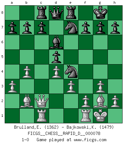 Last move : 1-0 2013 June 19 19:29:21 [Event "FICGS__CHESS__RAPID_D__000078"] [Site "FICGS"] [Date "2013.06.09"] [Round "1"] [White "Brulland,Emmanuel"] [Black "Bajkowski,Karol"] [Result "1-0"] [WhiteElo "1362"] [BlackElo "1479"] 1.b3 e5 2.Bb2 Nc6 3.g3 d5 4.e3 Nf6 5.Bg2 Bf5 6.Ne2 e4 7.d3 exd3 8.cxd3 Nb4 9.Nc1 Bd6 10.a3 Nc6 11.O-O O-O 12.d4 Re8 13.Nd3 Ne7 14.Nc3 Be4 15.Nxe4 Nxe4 16.Rc1 Rc8 17.Nc5 Nxc5 18.b4 Ne4 19.Qc2 1-0 Nimzovich-Larsen attack : Modern variation Kingside Castling by player White (move 11) Kingside Castling by player Black (move 11) Player White won this chess game. Follow this game move after move (download)If a ruler does not understand Chess, how can he rule over a kingdom ? (King Khusros II) Der vorletzte Fehler gewinnt. (Savielly Grigorievitsch Tartakower) En la perfecta combinación de Ajedrez como en una historia corta de primera clase, toda la trama y contra trama deberá conducir hacia un final sorprendente, el interes no es mitigado hasta el último momento. (Yates and Winter) Le temps de noter son nom sur la feuille de partie, j'étais déjà en zeitnot ! D'un modeste amateur apparié lors de la première ronde d'un open contre le grand-maître Azmaïparashvili. After growing wildly for years, the field of computing appears to be reaching its infancy. (John Pierce)