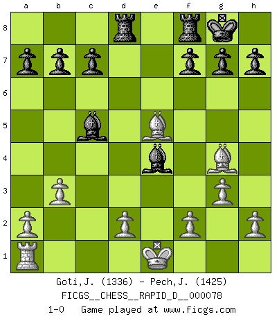 Last move : 1-0 2013 August 3 2:19:32 [Event "FICGS__CHESS__RAPID_D__000078"] [Site "FICGS"] [Date "2013.06.09"] [Round "1"] [White "Goti,Javier"] [Black "Pech,Jaroslav senior"] [Result "1-0"] [WhiteElo "1336"] [BlackElo "1425"] 1.c4 e5 2.Nc3 Nf6 3.g3 d5 4.cxd5 Nxd5 5.Qc2 Nc6 6.Nxd5 Qxd5 7.e4 Nd4 8.Qb1 Qc6 9.Bd3 Be6 10.b3 Rd8 11.Bb2 Bc5 12.Qd1 O-O 13.Nf3 Nxf3+ 14.Qxf3 Qd7 15.Bc3 Bg4 16.Bb5 Bxf3 17.Bxd7 Bxh1 18.Bg4 Bxe4 19.Bxe5 1-0 English : Bremen, reverse Dragon Kingside Castling by player Black (move 12) Player White won this chess game. Follow this game move after move (download)A good player is always lucky. (Jose Raul Capablanca) Der 70jährige Viktor Kortschnoi: Die Rentenanstalt wollte mich zwingen in Rente zu gehen. Meine Frau erhält jetzt eine Pension- und ich zahle weiter in die Rentenkasse ein! (Viktor Kortschnoi) Siempre es mejor sacrificar los hombres de tu oponente. (Savielly Tartakower) Les échecs sont un jeu par leur forme, un art par leur essence et une science par sa difficulté d'acquisition. Ils peuvent vous procurer autant de plaisir qu'un bon livre ou une belle musique, mais vous n'aurez une réelle joie que si vous arrivez à bien jouer. (Tigran Petrosian) The problem with manipulation is that people can turn on you. (Horatio Caine, C.S.I. Miami)