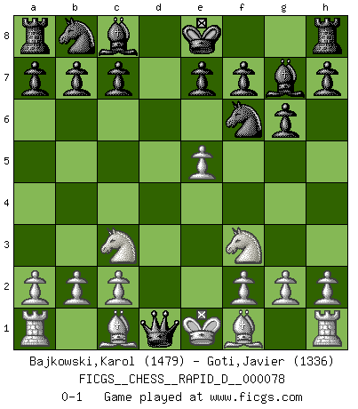 Last move : 0-1 2013 June 19 19:29:15 [Event "FICGS__CHESS__RAPID_D__000078"] [Site "FICGS"] [Date "2013.06.09"] [Round "1"] [White "Bajkowski,Karol"] [Black "Goti,Javier"] [Result "0-1"] [WhiteElo "1479"] [BlackElo "1336"] 1.d4 g6 2.e4 Bg7 3.Nf3 d6 4.Nc3 Nf6 5.e5 dxe5 6.dxe5 Qxd1+ 0-1 Modern defense Player Black won this chess game. Follow this game move after move (download)Chess is above all, a fight ! (Emanuel Lasker) Man gibt nur Pakete auf. (Paul Keres) Botvinnik trataba de restarle el misterio al Ajedrez, siempre relacionandolo a situaciones de la vida ordinaria. El gustaba de llamar al Ajedrez un típico problema inexacto similar a aquellos de los cuales la gente siempre tiene que enfrentarse en la vida cotidiana. (Garry Kasparov) Les Echecs, c'est l'art de la guerre sans les charniers, c'est la résurrection des morts tombés au champ d'honneur, l'espoir perpétuel, la suprématie de l'intelligence sur la force, la culture de l'esprit. (F. Szpiner) Lamb in skin of tiger, still fears the wolf. (Chinese proverb)