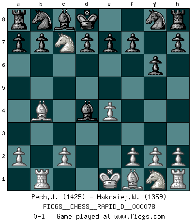 Last move : 0-1 2013 August 3 2:18:46 [Event "FICGS__CHESS__RAPID_D__000078"] [Site "FICGS"] [Date "2013.06.09"] [Round "1"] [White "Pech,Jaroslav senior"] [Black "Makosiej,Wladyslaw"] [Result "0-1"] [WhiteElo "1425"] [BlackElo "1359"] 1.e4 g6 2.d4 Bg7 3.Nc3 c5 4.dxc5 Qa5 5.Bd2 Qxc5 6.Nd5 Bxb2 7.Rb1 Bg7 8.Bb4 Qd4 9.Qxd4 Bxd4 10.Nc7+ Kd8 0-1 Robatsch defense Player Black won this chess game. Follow this game move after move (download)Chess is the art which expresses the science of logic. (Mikhail Botvinnik) Alles was ich jemals tun will ist Schach spielen. (Robert James Fischer) No existe un remordimiento como el remordimiento del Ajedrez. (H. G. Wells) La menace est plus forte que l'exécution. (Aaron Nimzovitch) The absolute truth is the thing that makes people laugh. (Carl Reiner)