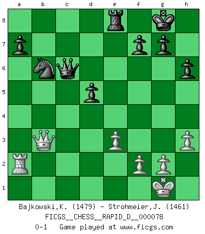 Last move : 0-1 2013 September 21 18:41:47 [Event "FICGS__CHESS__RAPID_D__000078"] [Site "FICGS"] [Date "2013.06.09"] [Round "1"] [White "Bajkowski,Karol"] [Black "Strohmeier,Josef"] [Result "0-1"] [WhiteElo "1479"] [BlackElo "1461"] 1.Nf3 Nf6 2.Nc3 d5 3.d4 e6 4.a3 Be7 5.Bg5 O-O 6.e3 h6 7.Bh4 c6 8.Bd3 Nbd7 9.O-O Qc7 10.Bg3 Bd6 11.Ne2 e5 12.dxe5 Nxe5 13.Nxe5 Bxe5 14.Bxe5 Qxe5 15.b4 Bf5 16.Bxf5 Qxf5 17.Rc1 Rad8 18.Nd4 Qe5 19.Qd3 Ne4 20.a4 Nd6 21.Rfe1 Rde8 22.b5 Rc8 23.bxc6 bxc6 24.h3 Ne4 25.c4 Nc5 26.Qc3 Nxa4 27.Qb3 Nb6 28.cxd5 cxd5 29.Nc6 Qc7 30.Red1 Rfe8 31.Rd2 Qd7 32.Ra2 Rxc6 33.Rxc6 Qxc6 0-1 Reti Opening Kingside Castling by player Black (move 5) Kingside Castling by player White (move 9) Player Black won this chess game. Follow this game move after move (download)What would Chess be without silly mistakes ? (Kurt Richter) Ich würde die 30 stärksten Spieler der USA im Simultanspiel besiegen. (José Raúl Capablanca) Los libros de Ajedrez deben de usarse igual como usamos los anteojos: para mejorar la vista, aunque algunos jugadores los quieren usar como si ellos les otorgaran la vision. (José Raúl Capablanca) A ce moment-là, je menaçais de comprendre la position ! (Clément L'Heureux) A government big enough to give you everything you want is strong enough to take everything you have. (Thomas Jefferson)