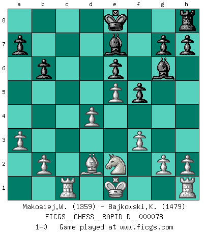 Last move : 1-0 2013 June 19 19:29:9 [Event "FICGS__CHESS__RAPID_D__000078"] [Site "FICGS"] [Date "2013.06.09"] [Round "1"] [White "Makosiej,Wladyslaw"] [Black "Bajkowski,Karol"] [Result "1-0"] [WhiteElo "1359"] [BlackElo "1479"] 1.d4 d5 2.c4 c6 3.Nc3 Nf6 4.e3 Bf5 5.cxd5 cxd5 6.Qb3 b6 7.Bb5+ Nbd7 8.Nxd5 Nxd5 9.Qxd5 e6 10.Bxd7+ Qxd7 11.Qxa8+ Qd8 12.Qxd8+ Kxd8 13.Bd2 Bd6 14.a3 Be4 15.f3 Bg6 16.e4 f5 17.e5 Be7 18.Ne2 Ke8 19.Rc1 1-0 QGD Slav defense Player White won this chess game. Follow this game move after move (download)Chess is a fairy tale of 1001 blunders. (Savielly Tartakower) Gegen einen Schachcomputer zu verlieren ist wie Löcher in den Strümpfen zuhaben. Es ist nicht peinlich, solange man der einzige ist der es weiß. (Anonymous) Es muy difícil jugar en contra de la teoría de Einstein. - en su primera derrota en contra de Fischer (Mikhail Tal) Les Echecs mettent en conflit, non pas deux intelligences, mais deux volontés. (Lasker) If computers get too powerful, we can organize them into committees. That'll do them in. (Anonymous)