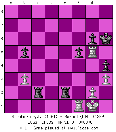 Last move : 0-1 2013 November 9 13:18:56 [Event "FICGS__CHESS__RAPID_D__000078"] [Site "FICGS"] [Date "2013.06.09"] [Round "1"] [White "Strohmeier,Josef"] [Black "Makosiej,Wladyslaw"] [Result "0-1"] [WhiteElo "1461"] [BlackElo "1359"] 1.e4 g6 2.d4 Bg7 3.Nc3 c5 4.Nf3 cxd4 5.Nxd4 Nc6 6.Be3 Nf6 7.Qd2 d6 8.Bb5 Bd7 9.O-O O-O 10.Rad1 a6 11.Be2 b5 12.a3 Ne5 13.Bh6 Neg4 14.Bxg7 Kxg7 15.h3 Ne5 16.b3 Qc8 17.f4 Nc6 18.Bf3 h5 19.Rc1 e5 20.Nxc6 Bxc6 21.Qxd6 Re8 22.fxe5 Nd7 23.Nd5 Rxe5 24.Ne7 Re6 25.Qb4 Qb7 26.Qc3+ Ne5 27.Nxc6 Qxc6 28.Qxc6 Rxc6 29.Be2 Rac8 30.Bd1 Rc3 31.Rb1 Re3 32.Bf3 Rxc2 33.a4 Nxf3+ 34.Rxf3 R3e2 35.Rg3 Rxe4 36.axb5 axb5 37.Rf3 R4e2 38.Rg3 f5 39.Rf1 h4 40.Rg5 Kh6 0-1 Robatsch defense Kingside Castling by player White (move 9) Kingside Castling by player Black (move 9) Player Black won this chess game. Follow this game move after move (download)Though most people love to look at the games of the great attacking masters, some of the most successful players in history have been the quiet positional players. They slowly grind you down by taking away your space, tying up your pieces, and leaving you with virtually nothing to do ! (Yasser Seirawan) Wer der Ansicht ist, daß alle Schachspieler verrückt sind, wird durch Studium des Lebens von Emil Josef Diemer nicht auf andere Gedanken kommen. (Hans Ree) El Ajedrez tiene tanto misterio como las mujeres. (Purdy) Même si vous avez un bon coup à faire, regardez toujours s'il n'y en a pas un qui lui soit préférable. (Pedro Damiano) Somehow our devils are never quite what we expect when we meet them face to face. (Nelson DeMille)