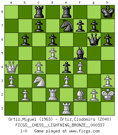 Last move : 1-0 2013 June 10 0:42:55 [Event "FICGS__CHESS__LIGHTNING_BRONZE__000337"] [Site "FICGS"] [Date "2013.06.09"] [Round "1"] [White "Ortiz,Miguel"] [Black "Ortiz,Clodomiro"] [Result "1-0"] [WhiteElo "1963"] [BlackElo "2040"] 1.d4 Nf6 2.Nf3 e6 3.Bf4 b6 4.c4 Bb7 5.e3 Bb4+ 6.Nbd2 O-O 7.Be2 Bxd2+ 8.Qxd2 d6 9.O-O Nbd7 10.Qc2 Qe7 11.Rad1 e5 12.Bg5 h6 13.Bh4 a5 14.Rfe1 Rfe8 15.Nd2 Rad8 16.f3 Nf8 17.d5 Ng6 18.Bf2 e4 19.f4 Bc8 20.Nb3 Ng4 21.Bxg4 Bxg4 22.Rd2 Qf6 23.Nd4 Bf5 24.a3 Ne7 25.Nb5 Rc8 26.h3 Qg6 27.Kh2 Kh8 28.Nc3 a4 29.Qxa4 1-0 This chess game has been lost on time (started : 2013.06.09 12:57:6) Queen's pawn game Kingside Castling by player Black (move 6) Kingside Castling by player White (move 9) Player White won this chess game. Follow this game move after move (download)Help your pieces so they can help you. (Paul Morphy) Schach ist das Spiel, das die Verrückten gesund hält. (Albert Einstein) Mi estilo es algo parecido entre un poco de Tal y Petrosian. (Reshevsky) Il n'y a pas eu de défaite parce que je ne crois pas que cet ordinateur ait jamais existé. IBM a triché en refusant d'imprimer les modes de recherche de la machine. C'est évident, pendant le match, des coups décisifs ont été joués par des êtres humains. Aujourd'hui, les meilleurs spécialistes en informatique ne peuvent toujours pas expliquer comment Deep-Blue a pu jouer contre la logique des ordinateurs. IBM a gagné une guerre de communication, mais ils sont incapables de prouver que l'ordinateur a gagné tout seul. (Garry Kasparov) The smarter you play, the luckier you'll be. (Mark Pilarski)