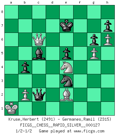 Last move : 1/2-1/2 2013 June 30 0:46:27 [Event "FICGS__CHESS__RAPID_SILVER__000127"] [Site "FICGS"] [Date "2013.06.09"] [Round "1"] [White "Kruse,Herbert"] [Black "Germanes,Ramil"] [Result "1/2-1/2"] [WhiteElo "2491"] [BlackElo "2315"] 1.e4 c5 2.Nf3 d6 3.d4 cxd4 4.Nxd4 Nf6 5.Nc3 a6 6.f3 e5 7.Nb3 Be6 8.Be3 Be7 9.Qd2 O-O 10.O-O-O Nbd7 11.g4 b5 12.g5 b4 13.Ne2 Ne8 14.f4 a5 15.f5 a4 16.fxe6 axb3 17.cxb3 fxe6 18.Bh3 Rxa2 19.Bxe6+ Kh8 20.Ng3 Nc7 21.Bc4 Qa8 22.Rhf1 Rxf1 23.Rxf1 Ra1+ 24.Kc2 Rxf1 25.Bxf1 d5 26.Qf2 g6 27.h4 Kg7 28.Kb1 Qf8 29.Qc2 Nc5 30.Bxc5 Bxc5 31.exd5 Nxd5 32.Qe4 Qd6 33.Qf3 Ne3 34.Be2 Qd5 35.Qf6+ Kg8 36.h5 Qxb3 37.Qc6 Qc2+ 38.Ka1 Kf7 39.h6 Ke7 40.Ne4 1/2-1/2 Sicilian : Najdorf Kingside Castling by player Black (move 9) Queenside Castling by player White (move 10) This chess game ended in a draw. Follow this game move after move (download)Play the opening like a book, the middle game like a magician, and the endgame like a machine. (Spielmann) Alle Schachspieler sollten auch ein Hobby haben. (Savielly Grigorievitsch Tartakower) El hombre es un frívolo, una creatura engañosa y como un jugador de Ajedrez, se preocupa mas por el proceso de obtener su meta que de la meta por sí misma. (Dostoyevsky) Les ravages du H expliquent la différence de niveau entre Tal et Thal [Abergel]. Art is the triumph over chaos. (John Cheever)