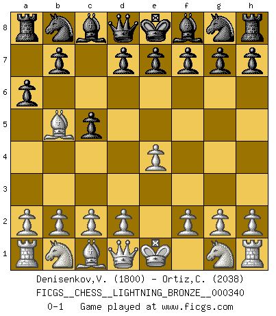 Last move : 0-1 2013 June 10 19:38:50 [Event "FICGS__CHESS__LIGHTNING_BRONZE__000340"] [Site "FICGS"] [Date "2013.06.10"] [Round "1"] [White "Denisenkov,Valentin"] [Black "Ortiz,Clodomiro"] [Result "0-1"] [WhiteElo "1800"] [BlackElo "2038"] 1.e4 c5 2.Bb5 a6 0-1 This chess game has been lost on time (started : 2013.06.10 19:6:49) Sicilian defense Player Black won this chess game. Follow this game move after move (download)Examine moves that smite! A good eye for smites is far more important than a knowledge of strategical principles. (Purdy) Privat ist Kortschnoi kein schlechter Mensch, sehr sympathisch. Aber während des Spiels ist er grausam. Er will dich töten. (Miguel Najdorf) EL Ajedrez es como la vida. (Boris Spassky) J'ai toujours senti une vague pitié pour l'homme qui ne connaît rien aux échecs, tout comme j'en aurais pour un homme ignorant de l'amour. Les Echecs, comme la musique ou comme l'amour, ont le pouvoir de rendre heureux. (Siegbert Tarrasch) Memory is a way of holding onto the things you love, the things you are, the things you never want to lose. (from the television show: The Wonder Years)