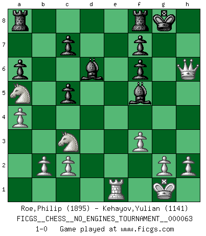 Last move : 1-0 2013 July 11 18:57:5 [Event "FICGS__CHESS__NO_ENGINES_TOURNAMENT__000063"] [Site "FICGS"] [Date "2013.06.11"] [Round "1"] [White "Roe,Philip"] [Black "Kehayov,Yulian"] [Result "1-0"] [WhiteElo "1895"] [BlackElo "1141"] 1.e4 e5 2.Nf3 Nc6 3.Bb5 a6 4.Bxc6 bxc6 5.O-O d6 6.d4 exd4 7.Nxd4 Nf6 8.Nc3 c5 9.Nc6 Qd7 10.Na5 Be7 11.Bf4 O-O 12.Qe2 Qe6 13.f3 Bd7 14.a4 Bc8 15.Rad1 Qd7 16.Rfe1 h6 17.e5 dxe5 18.Rxd7 Bxd7 19.Bxe5 Bd6 20.Bxf6 gxf6 21.Qd2 Bf5 22.Qxh6 1-0 Ruy Lopez : Exchange variation Kingside Castling by player White (move 5) Kingside Castling by player Black (move 11) Player White won this chess game. Follow this game move after move (download)It is difficult to play against Einstein's theory --on his first loss to Fischer. (Mikhail Tal) Die FIDE ist dabei in die Hände der russischen Mafia zu fallen. (Larry Evans) No existe un remordimiento como el remordimiento del Ajedrez. (H. G. Wells) Les sacrifices démontrent seulement que quelqu'un a gaffé. (Savielly Tartacover) You can't play chess if you're groggy from pills. (Anatoly Karpov)