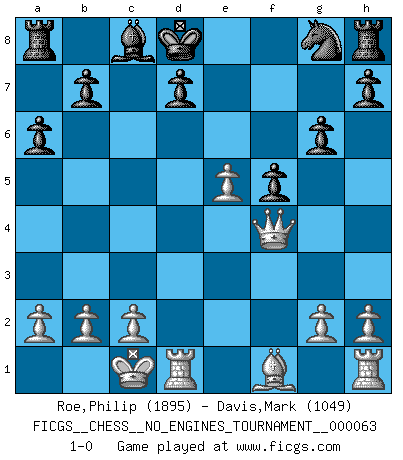 Last move : 1-0 2013 September 3 1:14:5 [Event "FICGS__CHESS__NO_ENGINES_TOURNAMENT__000063"] [Site "FICGS"] [Date "2013.06.11"] [Round "1"] [White "Roe,Philip"] [Black "Davis,Mark"] [Result "1-0"] [WhiteElo "1895"] [BlackElo "1049"] 1.Nc3 e5 2.Nf3 Nc6 3.d4 exd4 4.Nxd4 g6 5.Nd5 Bg7 6.Nb5 Be5 7.f4 Bd6 8.e4 a6 9.Nxd6+ cxd6 10.Be3 Nce7 11.Bb6 Nxd5 12.Bxd8 Nxf4 13.Qxd6 Kxd8 14.Qxf4 f6 15.e5 f5 16.O-O-O 1-0 This chess game has been lost on time (started : 2013.06.11 6:52:43) Dunst (Sleipner-Heinrichsen) Opening Queenside Castling by player White (move 16) Player White won this chess game. Follow this game move after move (download)Chess is life. (Bobby Fischer) Im Hotelzimmer gab es nur zwei Schaben. (Über die Turnierbedingungen) (Peter Swidler) La señal de un Gran Maestro es su habilidad de ganar una partida rápidamente y sin dolor. (Irving Chernev) Les ravages du H expliquent la différence de niveau entre Tal et Thal [Abergel]. He is a liar. I just don't know what the lie is yet. (Horatio Caine, C.S.I. Miami)
